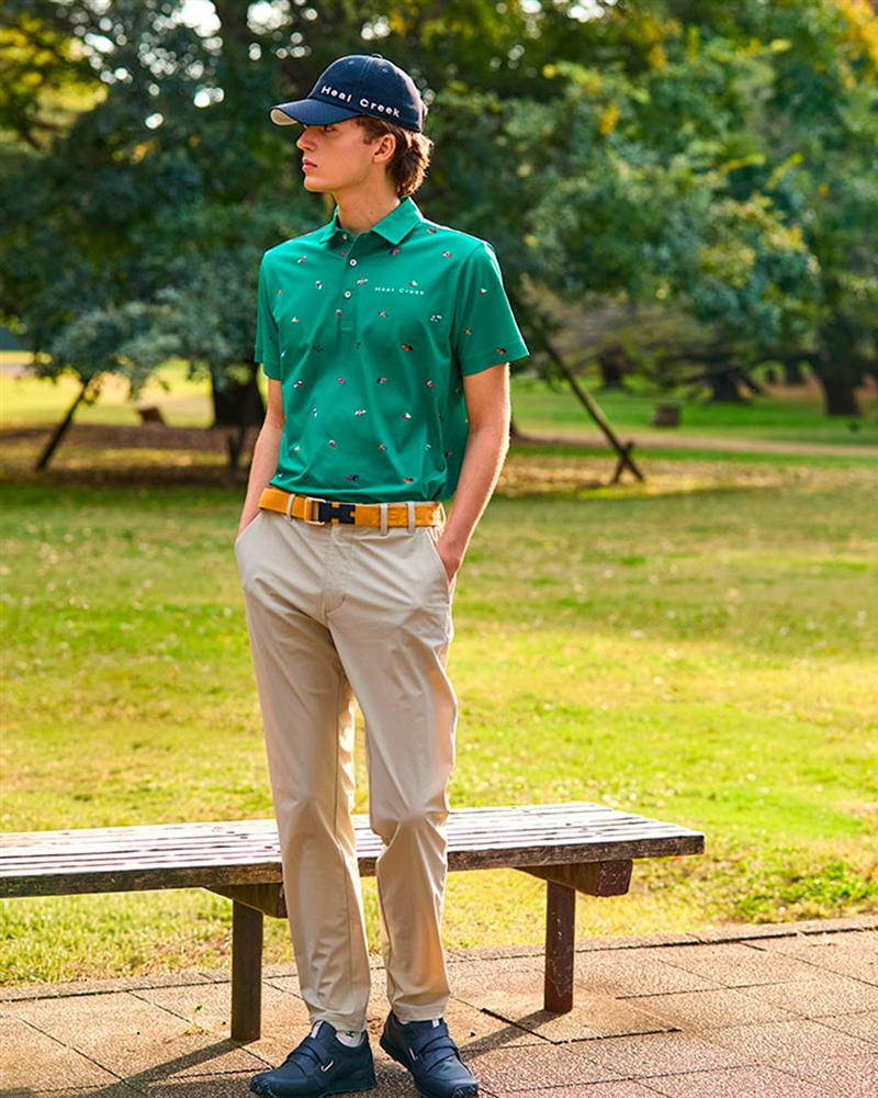 爽やかなグリーンのポロシャツがコースの中で映える、軽やかなコーディネート。ベージュのパンツは柔らかな印象を与え、洗練されたカラーリングで上品さを演出します。ネイビーのシューズとキャップで引き締めつつ、ラフすぎない大人のリゾートスタイルを実現。品格ある着こなしに最適です。