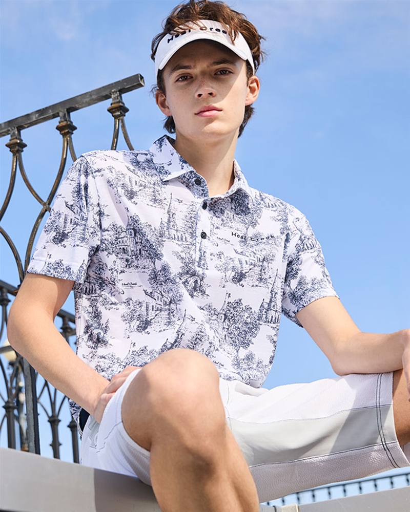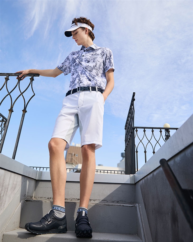 爽やかなプリントシャツとホワイトのショートパンツで軽快に仕上げた夏のコーディネート。涼しげなデザインが季節感を演出しつつ、ショートパンツが動きやすさをサポート。ネイビーのベルトで全体を引き締め、程よいアクセントをプラスします。カジュアルさと上品さを兼ね備えた、ラウンド映えするスタイルです