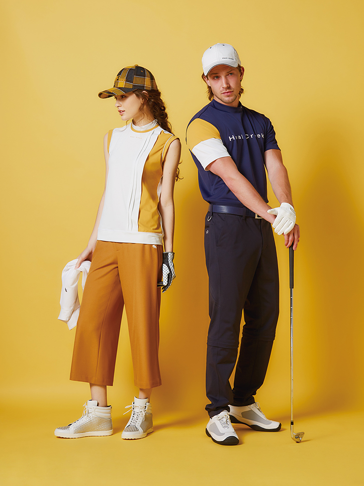 メンズ・・・右袖をカラー切り替えにして派手やかな印象のモックネックシャツ。前衿は低くしているので暑苦しくないようにしているのもポイント。ハリのある素材で仕立て映えしてきれいな仕上がりです。パンツはひざ下ファスナーがついて取り外し可能。ロング&ショーツの2タイプの着こなしができます。しなやかな素材でストレッチ性も優れており快適な履き心地ですがシルエットも綺麗。スポーティーに着こなしていただけます。