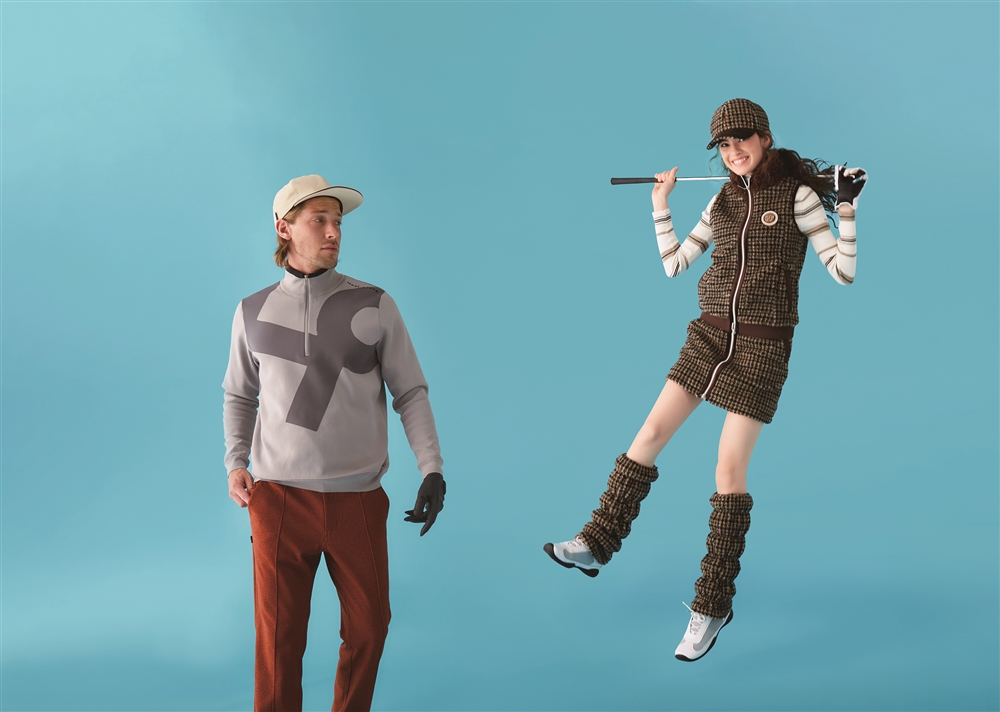 メンズ・・・撥水性のある糸で編み雨を弾くニットです。防風の裏地を身頃、袖までついているので冷たい風もシャットアウトできる優れもの。ストレッチ性もありゴルフの動きに対応し快適です。パンツはスリムなシルエットで、シャープな印象のピンタックを入れて足長効果をもたらしてくれます。オレンジ系の色味と合わせてハイセンスに。
