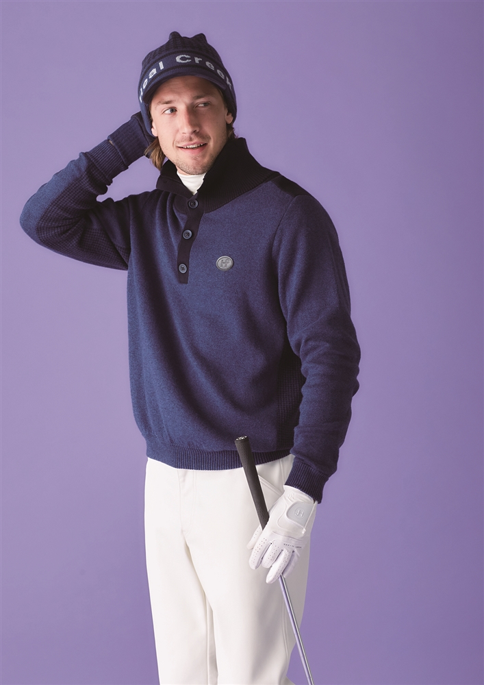 上質なコットンにカシミヤが入って肌触りがとても気持ちいい。両面編みにすることで編地がしっかりして風合いもよく暖かい。脇の千鳥格子柄がゴルフシーンによく映えます。気品と知性を感じるパープルカラーが新鮮です。暖かいニットキャップに合皮のツバがついて上質な感じがいい。ソフトな編地でチクチクしないのでゴルフに集中できます。