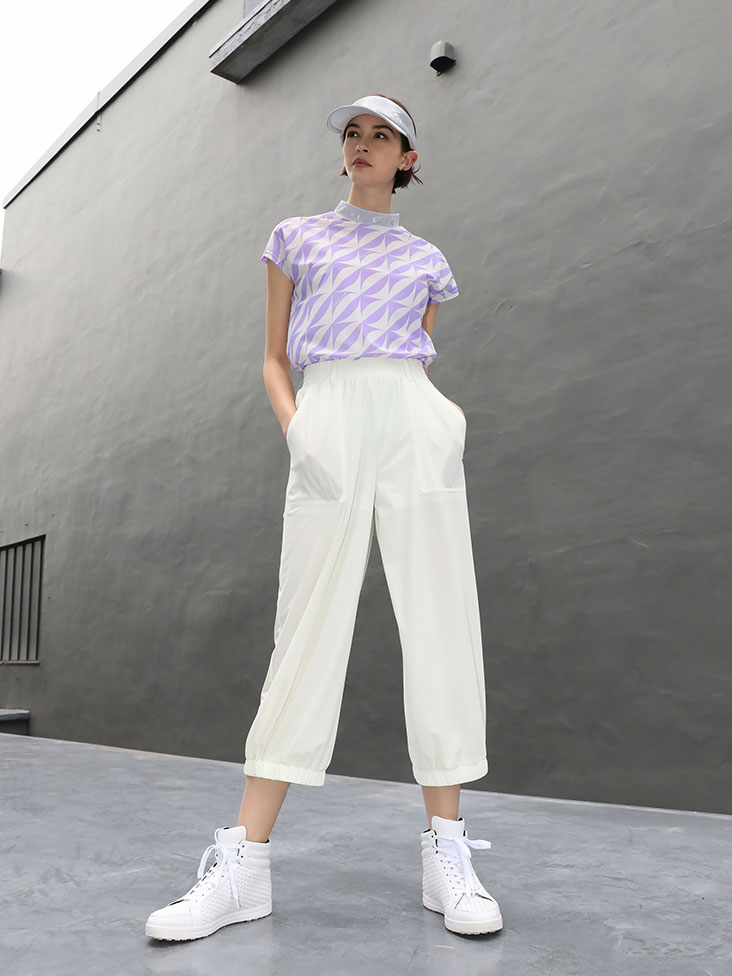 22AWテーマの幾何学模様のトップスは肌に貼り付きにくく体のラインも拾わず、程よいゆとりのフレンチスリーブは袖口から風が通り、暑い日も熱がこもらず快適なプレイを楽しんでいただけます。また今回ジョガーパンツを新しく企画。ウエストと足口のギャザー分量で肌とのゆとりが出来、トップス同様に貼り付きが軽減され快適な着心地とNEWシルエットを実感頂けます。同素材のブルゾンもあるのでセットアップとしても着用していただけます。