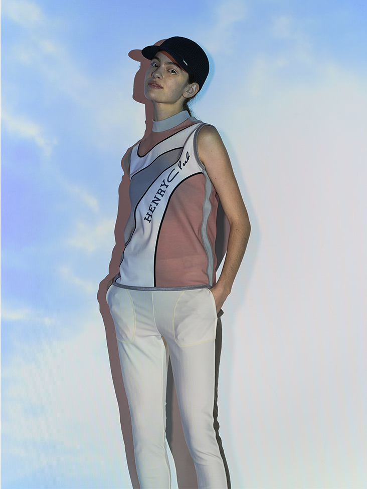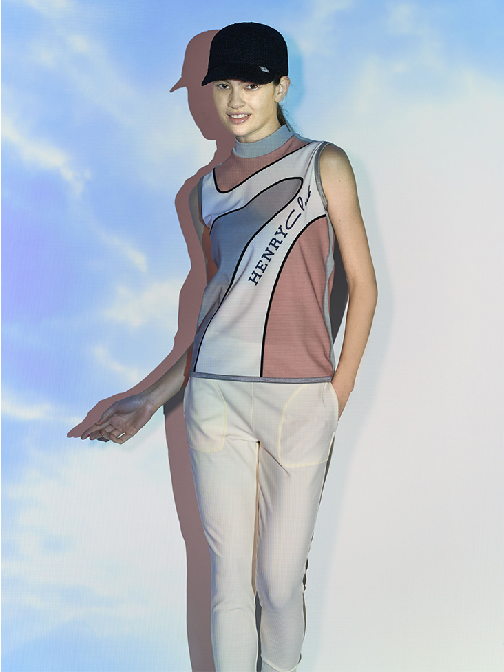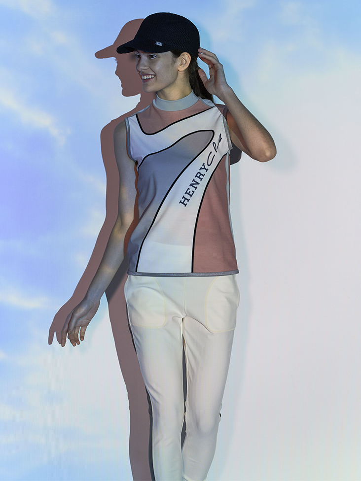 大胆な柄がプリントされた素材は小さなドットが開いて通気性抜群、夏場に最適な素材です。カーブのアシメトリーな柄が今シーズンの象徴。機能性も抜群な素材感で大胆な柄にシンプルなシルエットが意外にコーディネートし易く、1枚でも華やかなアイテムです。ゴルフ場に映える事間違いなしです。