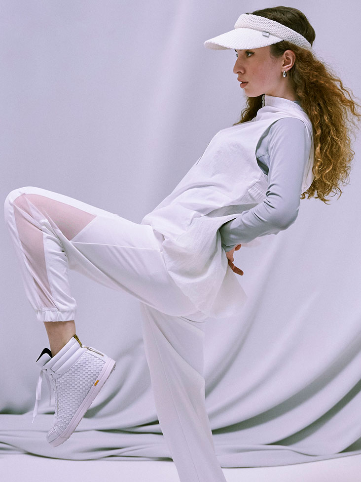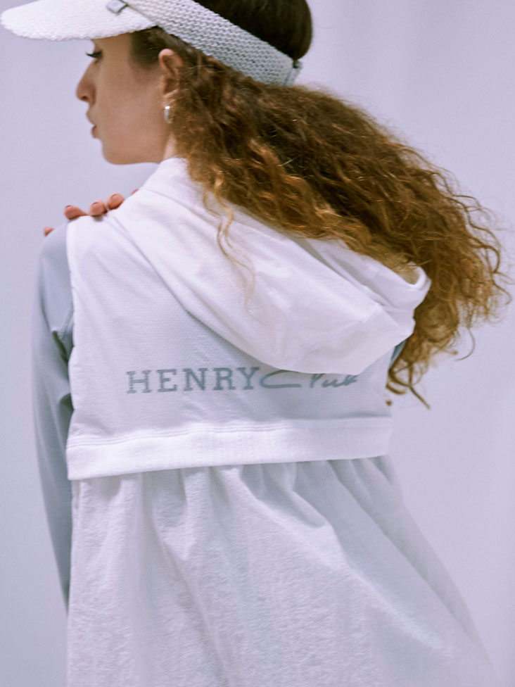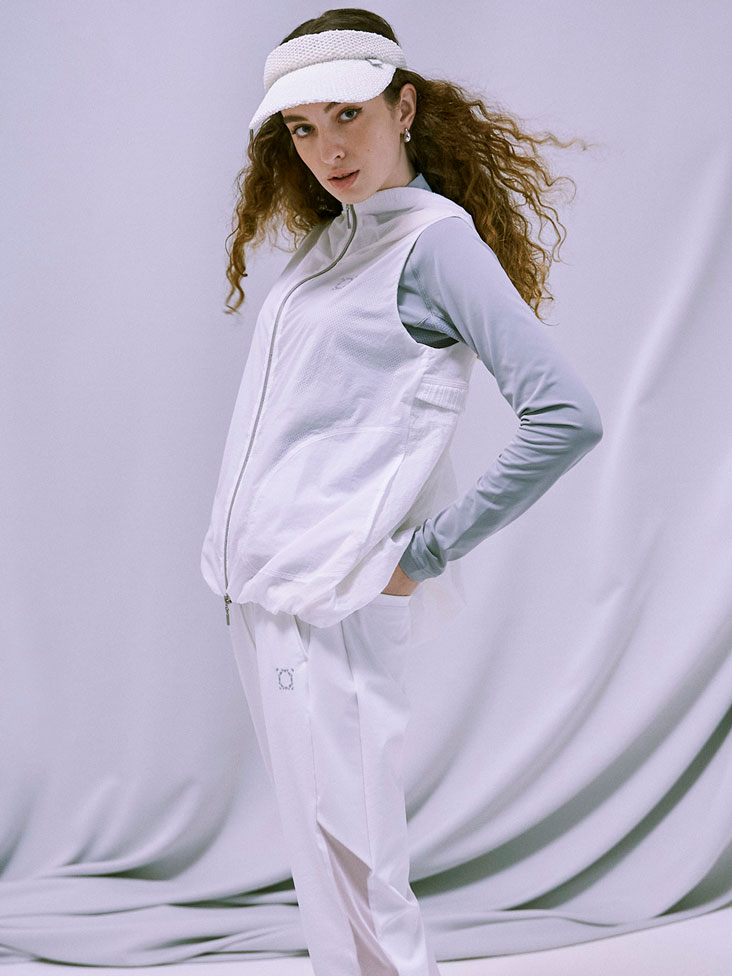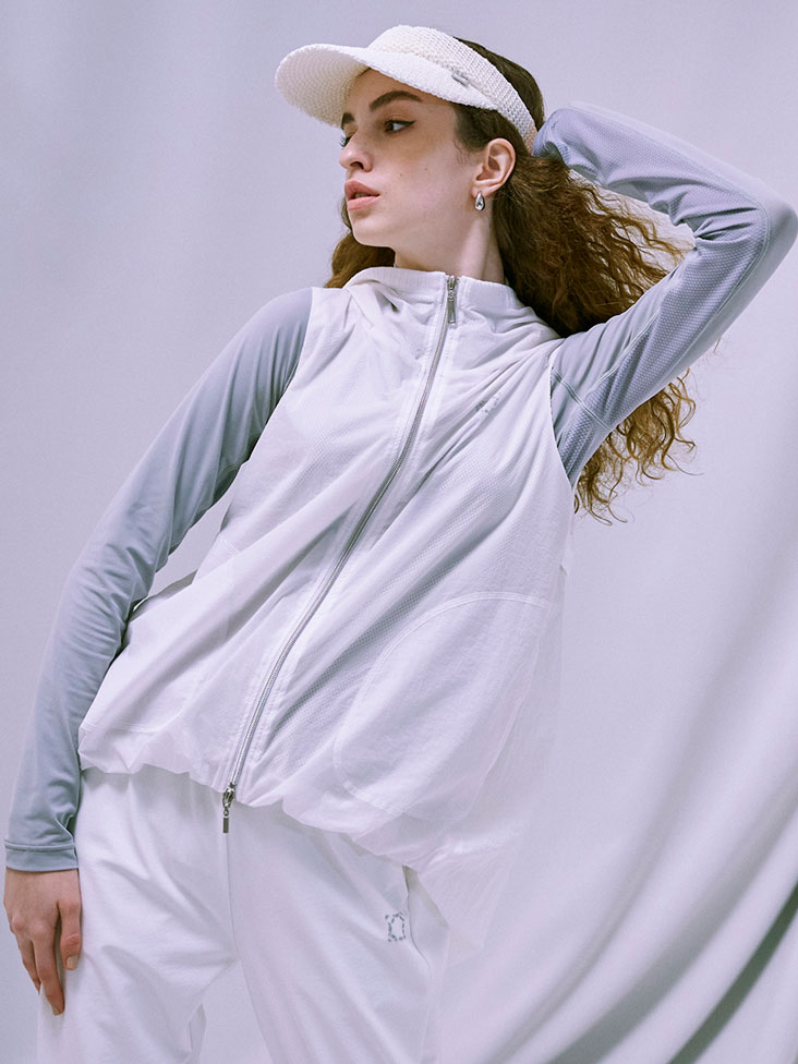 撥水性機能があるフレアシルエットのジップベスト。上品な素材の透け感とバルーンシルエットのデザインが軽やかなムードをまとい1枚で様になるアイテムです。透け感が新鮮なコーディネートです。
