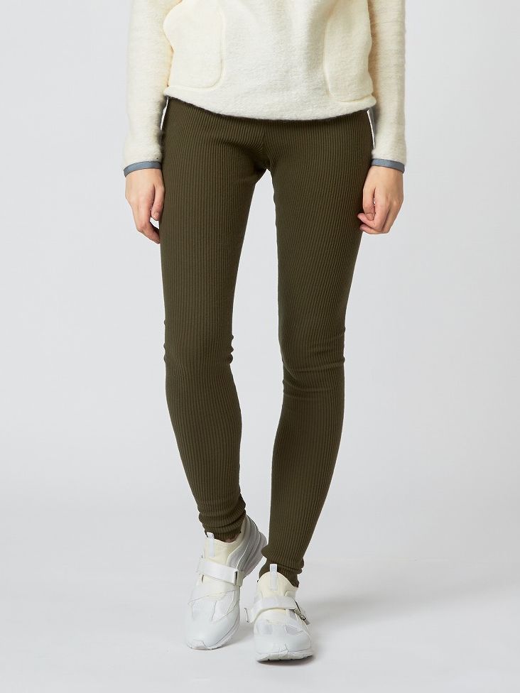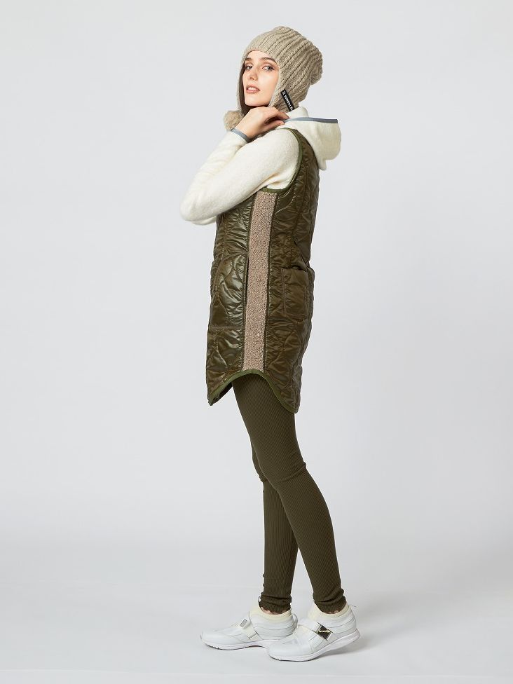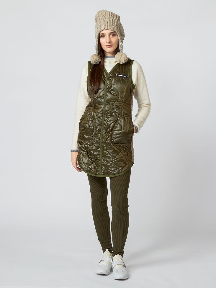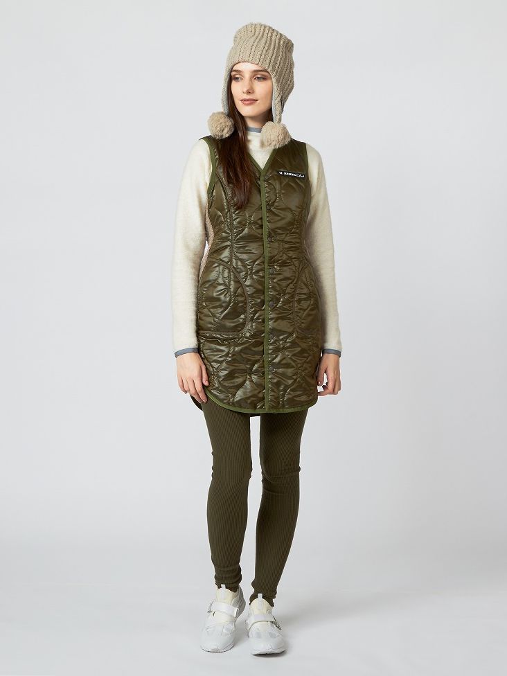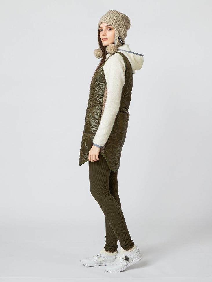 軽量で保温性の高いキルティングワンピースに、長め丈で吸湿発熱性があるレギンスを組み合わせて、寒い時期でも軽快なコーディネート。防寒性の高いイヤーワッチがアクセント。
