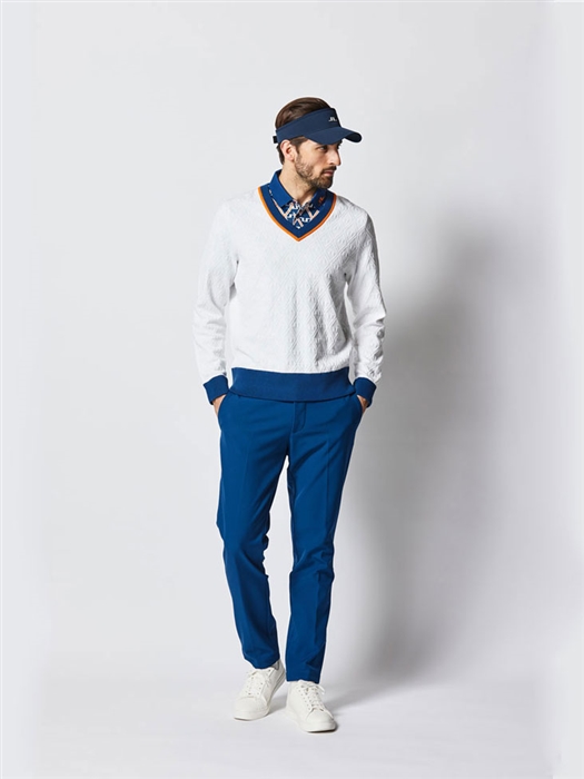 ネイビーとオレンジでまとめた秋のスタイリング。中に着込んだブリッジマーク柄のシャツがコーデのポイントに。パンツは内側がフリース素材。ストレッチ機能もあるので、暖かく動きやすいアイテム。