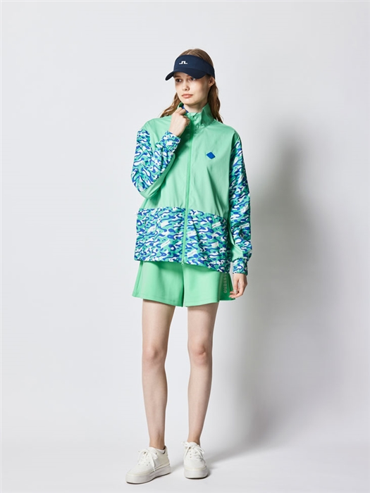 グリーンでまとめた、シーズンプリントのブロッキングが目立つ秋のスタイリング。パンツはハイウエストになっており、スタイルアップにも。また、フレアになっているためショートパンツでもぴたっとしすぎず綺麗に着こなすことができます。