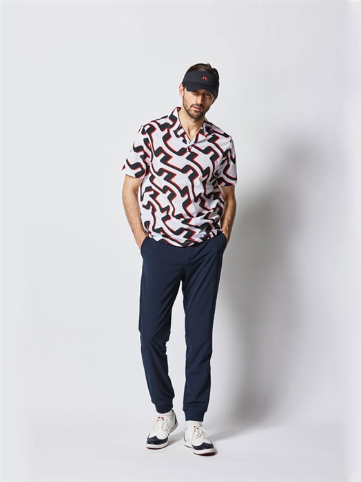 ブラック×レッドの開襟シャツでクールなスタイリング。ボトムスにジョガーパンツを合わせることで程よい抜け感に。ウエストはゴムではなくボタンタイプなので、カジュアルすぎず色んなシーンで着用いただけるアイテムです。