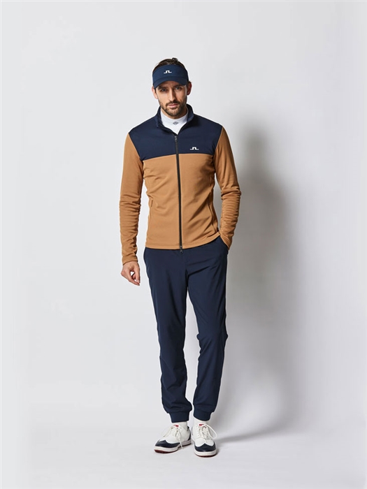秋らしいブラウンとネイビーのブルゾンコーデ。バックには J.Lindeberg のスタイリッシュなロゴ入り。内側は起毛しているので暖かさも心配なし。ジップを少し下げるとホワイトのモックネックがコーデのアクセントに。ジョガーパンツはカジュアルにもフォーマルにも使える重宝するアイテムです。