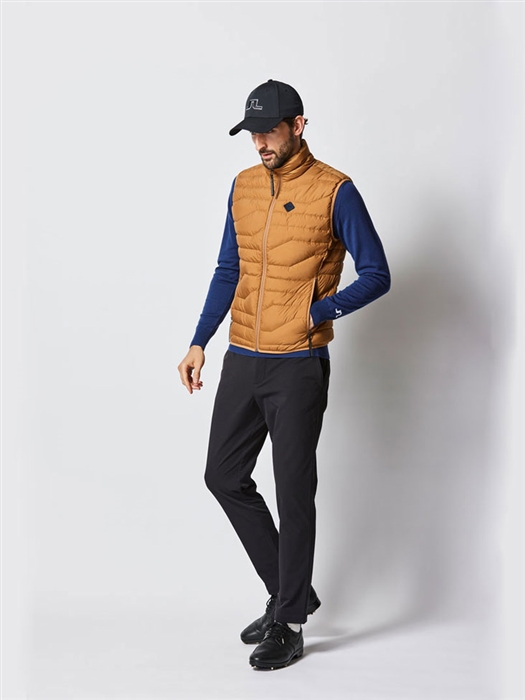 落ち着いたブラウンのダウンベストは軽量で、スイングの邪魔をしない動きやすいアイテム。胸元のシリコンブリッジマークがポイント。中にはネイビーの長袖シャツを着ることで、暗くなりすぎず垢抜けたコーデに。