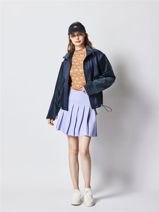 オレンジ×パープルの秋にぴったりなコーデ。暖かみのある、ソフトで高級感のあるベロアブルゾンがコーデを子供っぽく見せないポイントに。スカートは毎シーズン人気のプリーツスカート。定番のホワイトやネイビーに飽きてしまった人にもおすすめのパステルカラー。