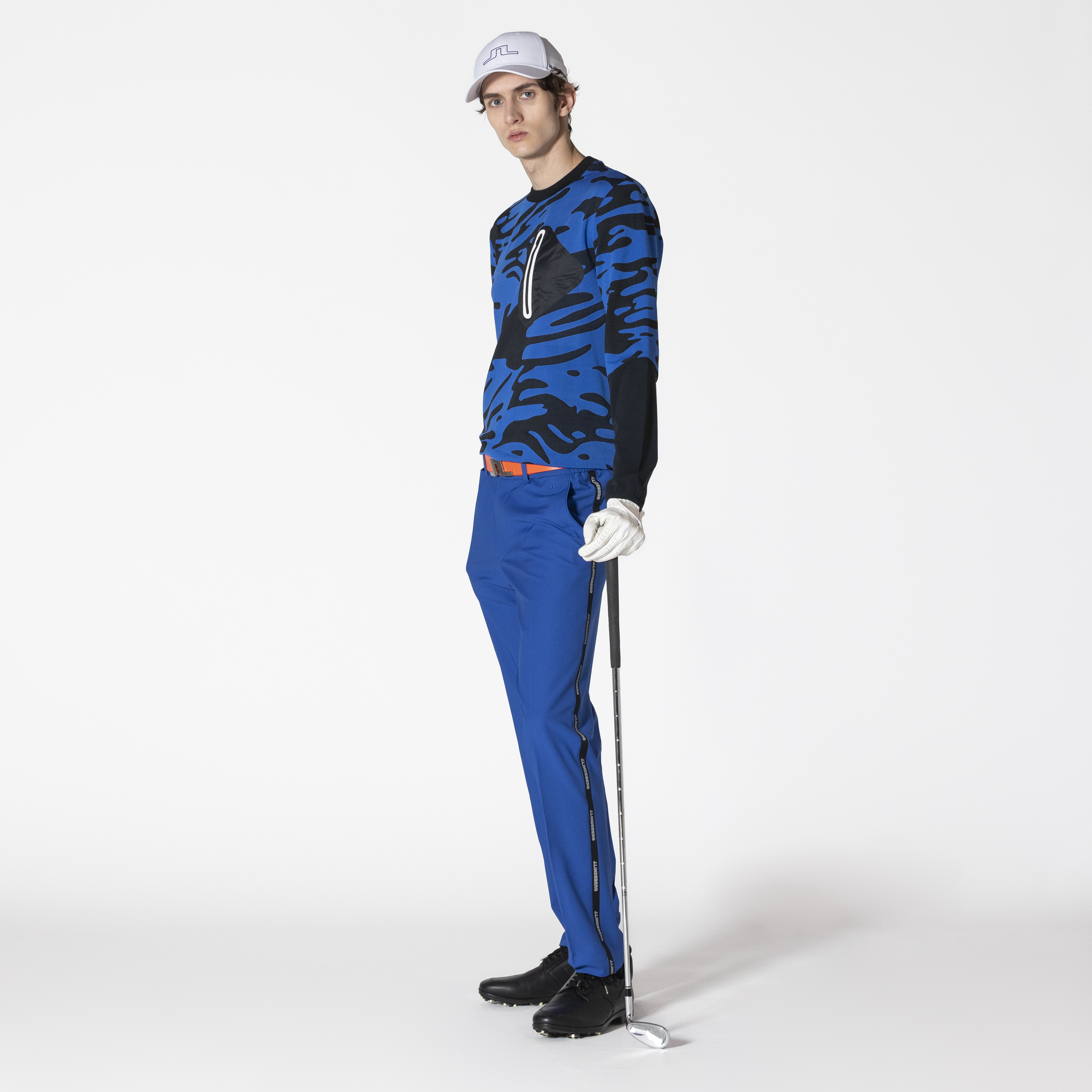 ブルーのコーディネートにオレンジベルトでアクセントをつけたスポーティーなスタイリング。左胸には圧着テープ使用のジッパー付きポケット。パンツのサイドラインでスッキリとしたファッショナブルな印象に。