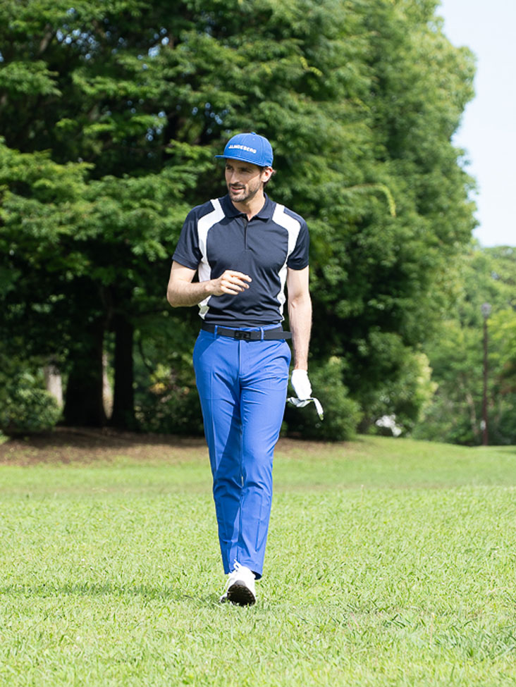 ショルダー部分のブリッジマークが特徴のトップスに、鮮やかなブルーで統一したキャップとパンツを合わせることでクールな印象のスタイリングに。さらにネイビーのベルトでしまった印象に。