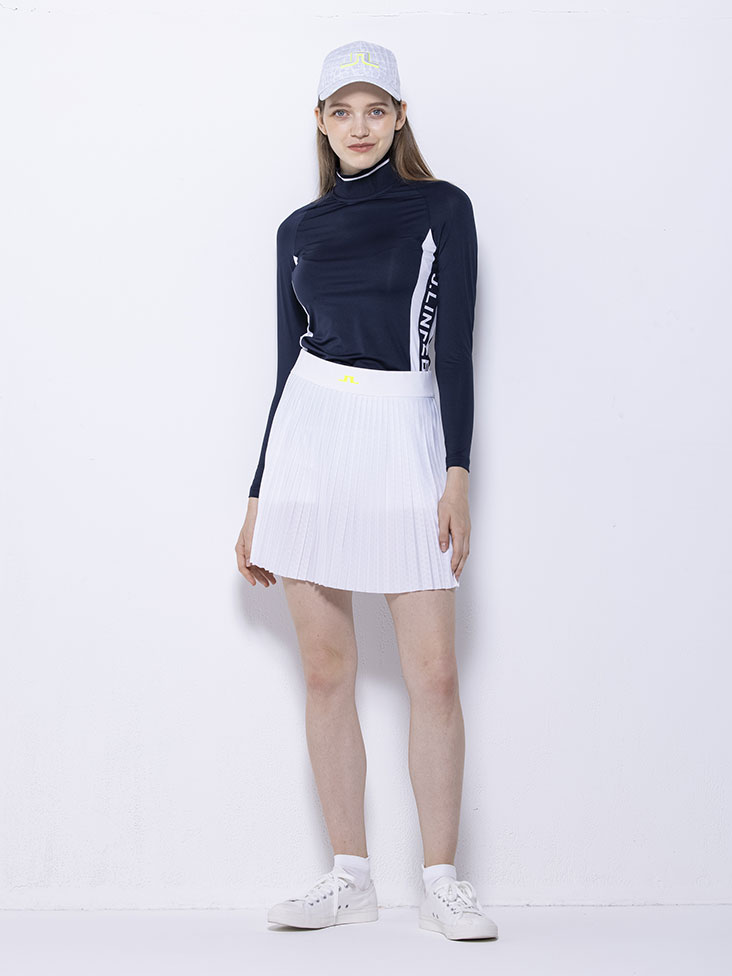 今季レディースゴルフでイチオシのサイドロゴデザインのシャツを使用したスタイリング。スポーティな印象のサイドロゴデザインと女性らしいプリーツスカートが抜群のバランス。タイトなシルエットのシャツを、シャツインしたハイウエストスタイリングも今っぽい着こなし。