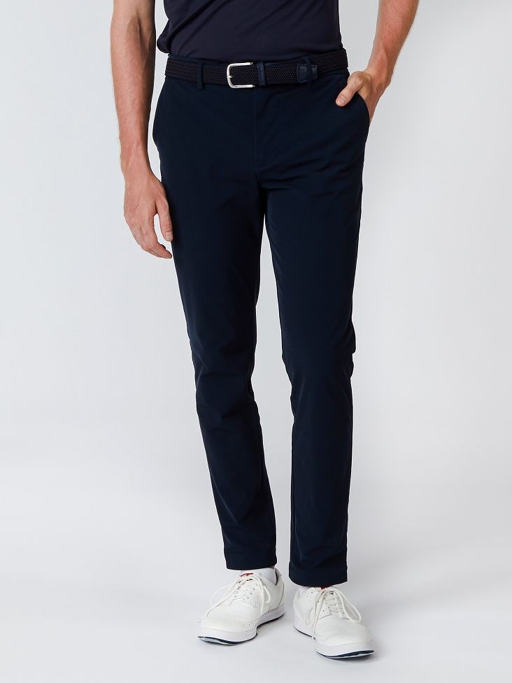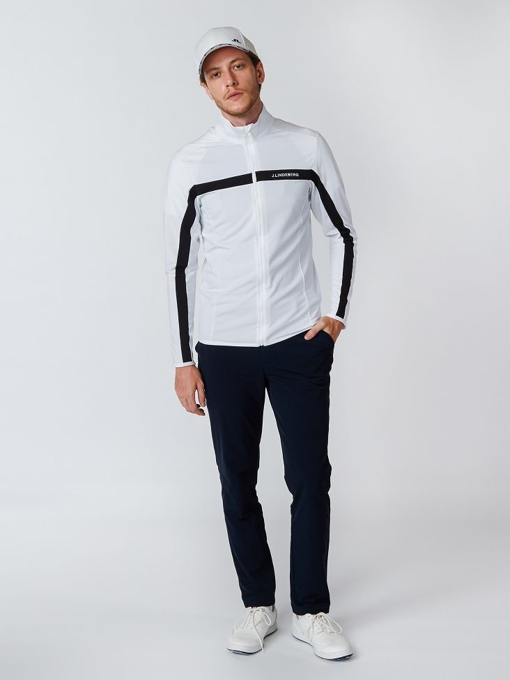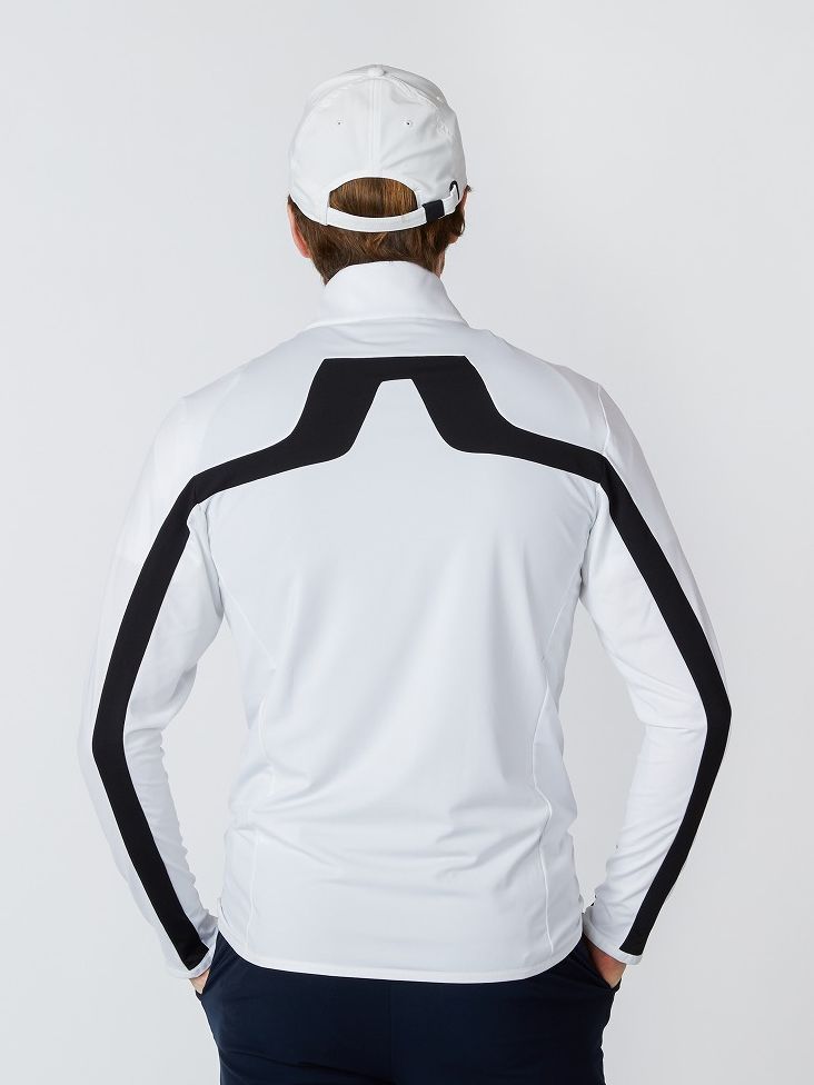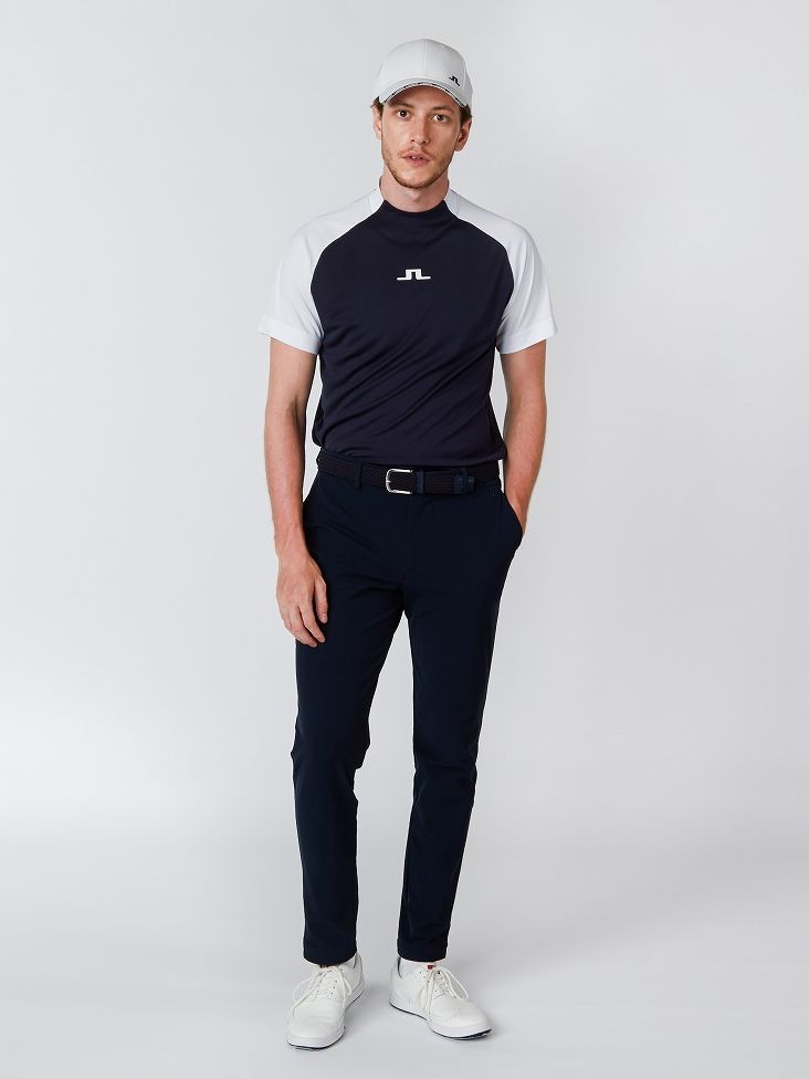モックネックのシャツにミドラーを合わせ首元をスッキリとさせることで余計なストレスを感じさせないスポーツスタイル。背中のバックブリッジが特徴的でゴルフ場でも存在感大。