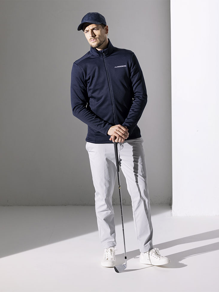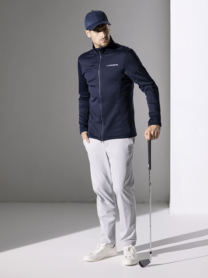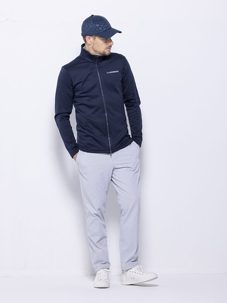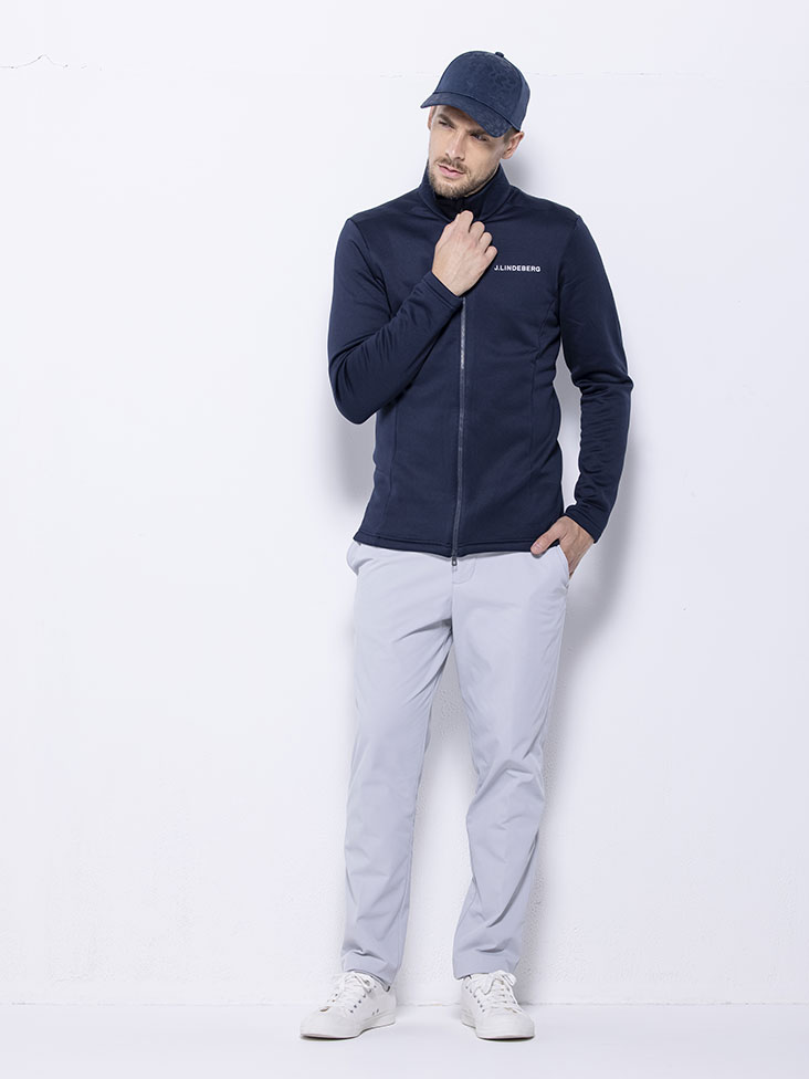 今季Jリンドバーグ本国おススメの超撥水機能のついたトラックジャケットを使用したスタイリング。トラックジャケットは30分の雨に耐えられる超撥水機能を持った裏起毛の素材を使用。パンツは裏起毛しながらも、ストレッチ性の高い素材を使用した防寒パンツ。