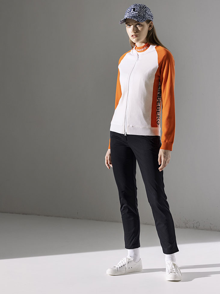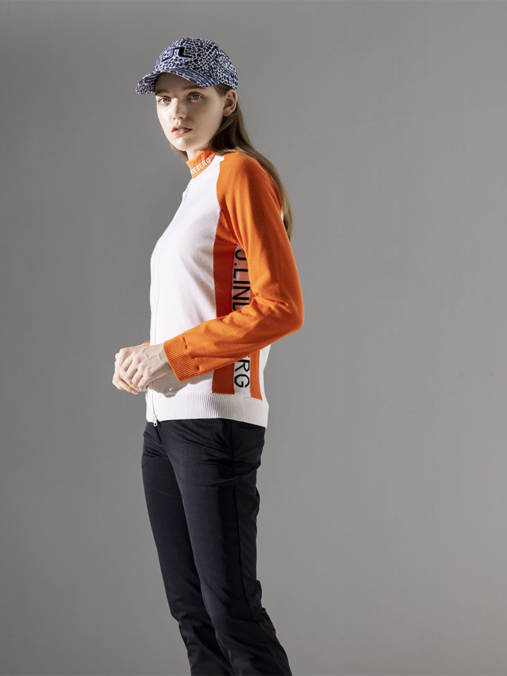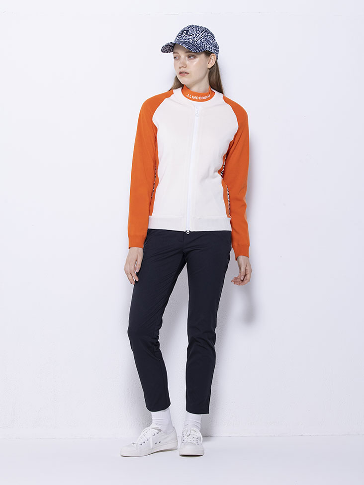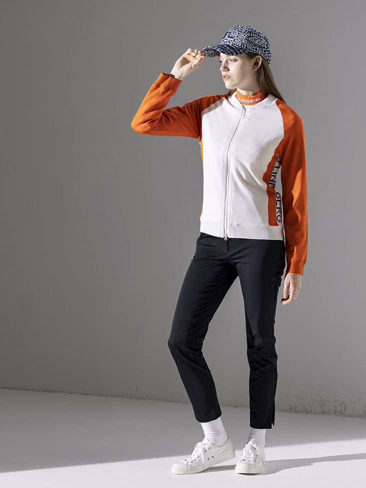今季レディースゴルフでイチオシのサイドロゴデザインのニットアウターを使用した防寒スタイル。防風裏地の付いたジップアップニットアウターは着膨れせずに、スッキリと見せられるアイテム。
