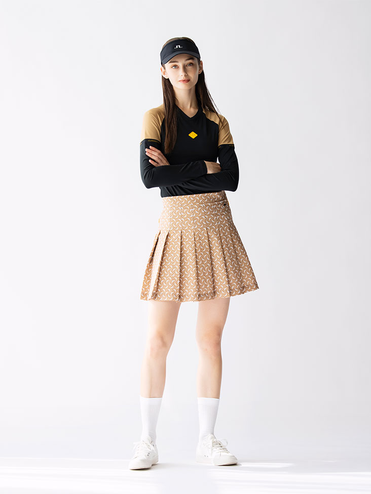 内側を起毛した変形丸首の長袖シャツ。インナーとしても使用できるので長く使えます。定番のプリーツスカートは今季は総柄タイプ。Aラインを意識し女性らしいシルエットに。
