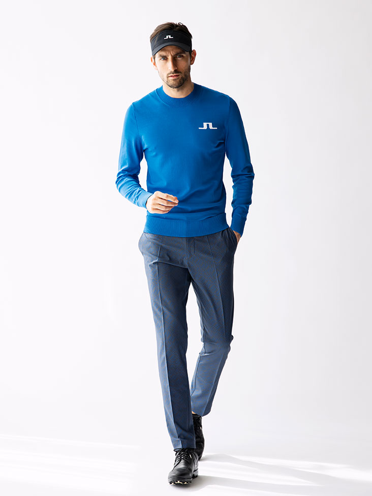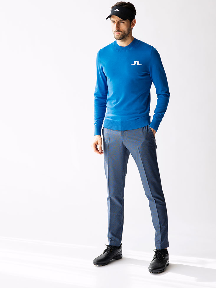 最軽量のビスコース/ナイロンニットで、胸と首にジャカードブリッジのロゴがあるクルーネックセーター。ボトムはブリッジマークのモノグラム柄をプリントしており、派手過ぎず大人スタイリングに。