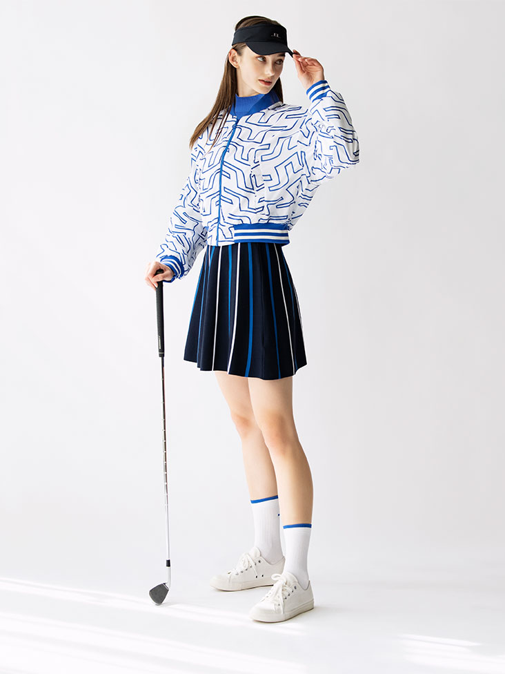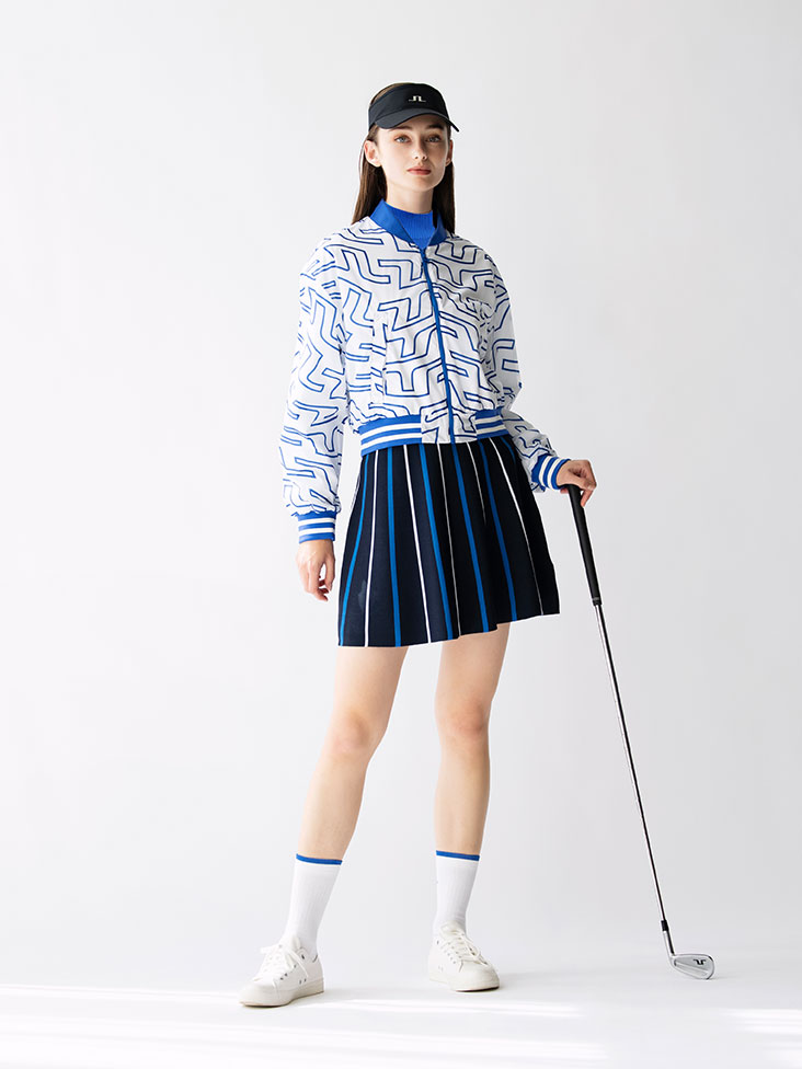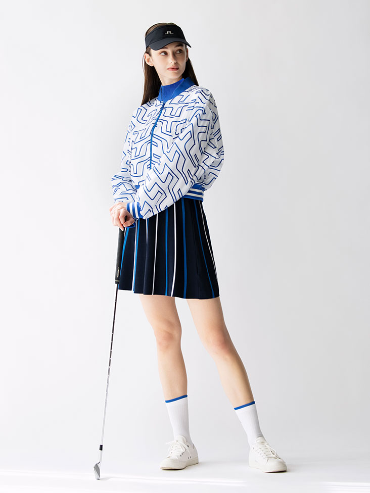 ブリッジマークがモチーフのショート丈のウィンドブレーカーとニットスカートを合わせて甘目な印象に。内側にメッシュが施されていますが軽量で使いやすい仕様。
