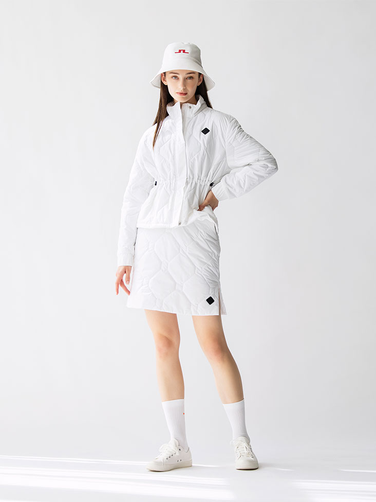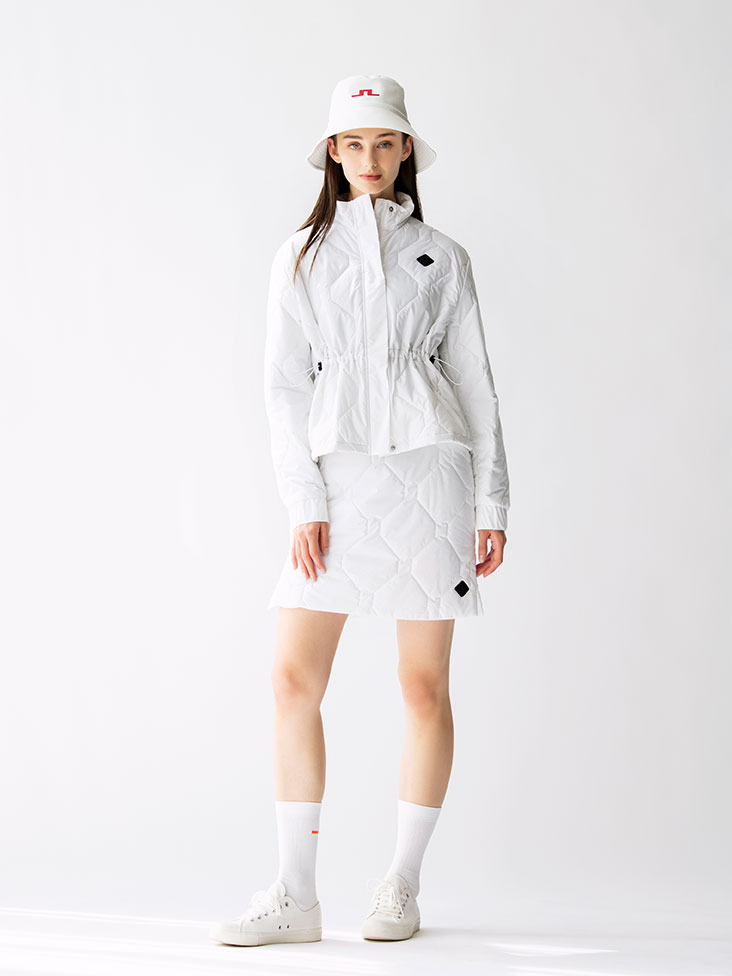 リサイクルポリエステル100%で作られたキルティングのセットアップ。ウエストが絞れるタイプで細見え効果も期待できます。