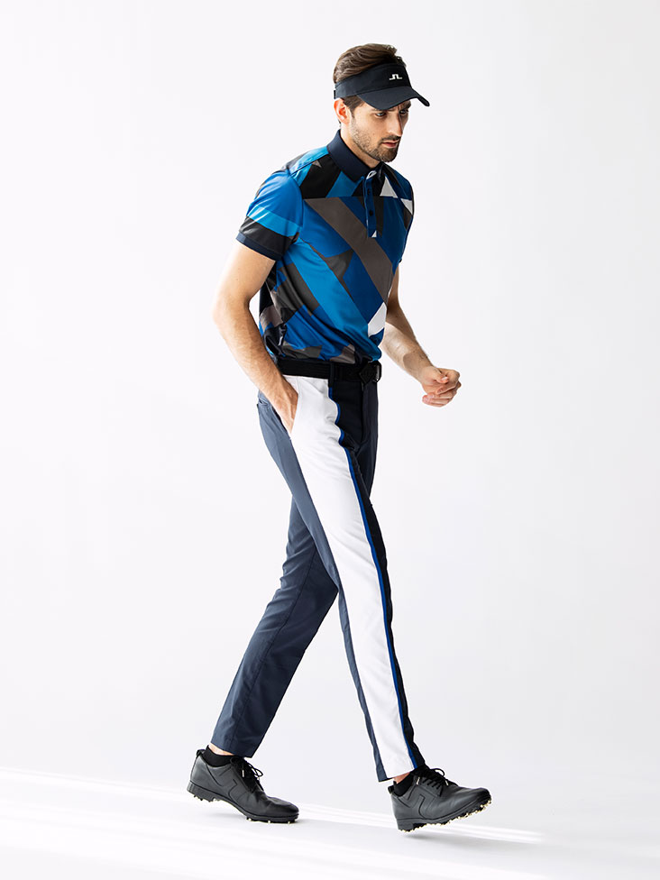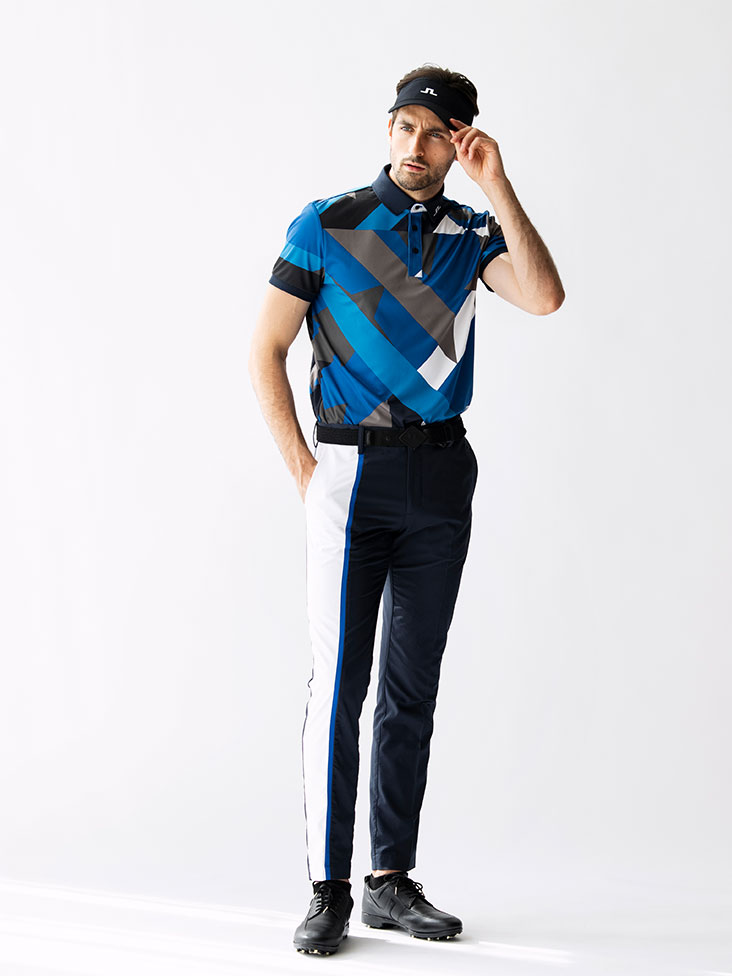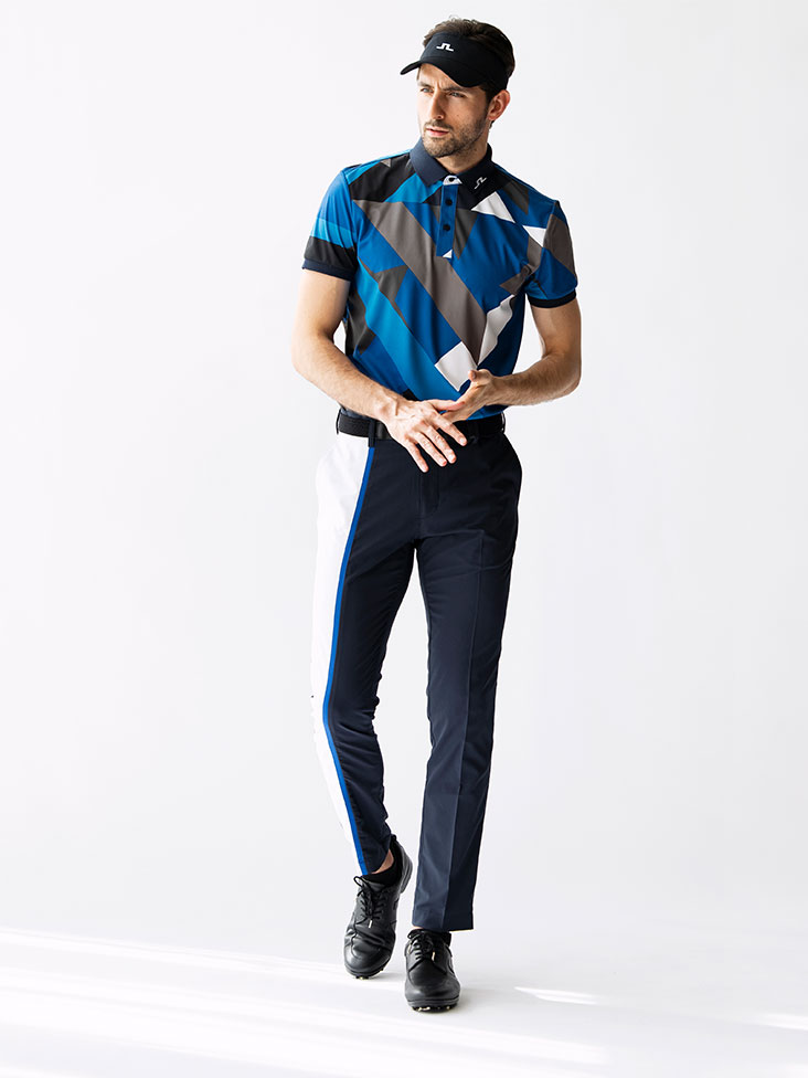 足長・着やせ効果絶大のスタイリング。幾何学柄が目を惹きますが今季テーマカラーのブルー落ち着いた印象を持たせます。