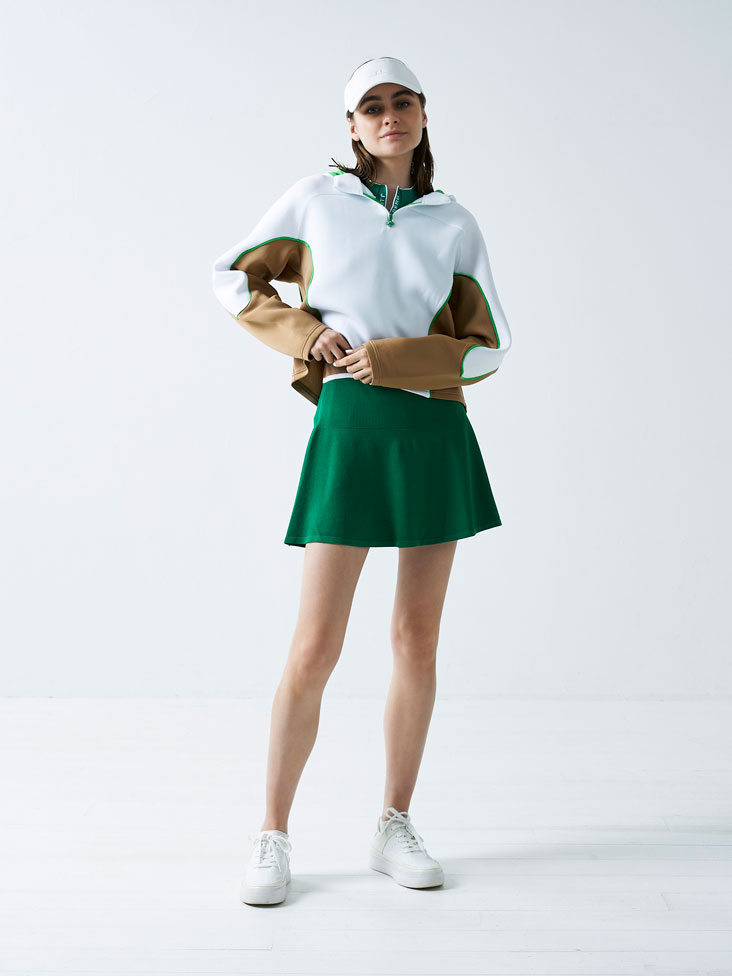 グリーンをベースに、カラーブロックのパーカーでアースカラーを取り入れたスタイリング。フード内側がグリーンになっているのもポイント。ゴルフ場で馴染むカラーのスタイリングになっています。