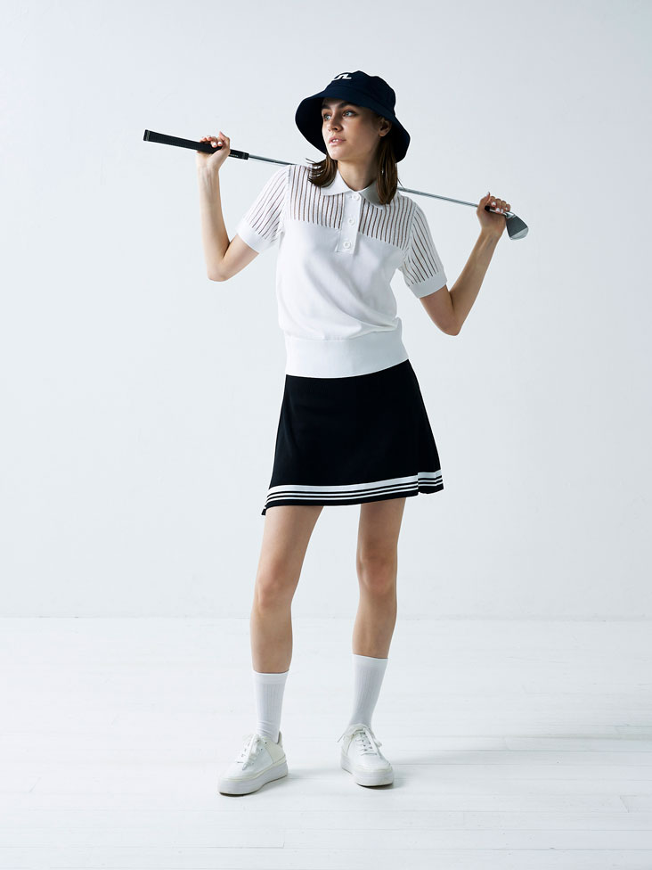 甘めのデザインのトップスですが、ライン入りのスカートと合わせることでスポーティーさがミックスされたコーディネートに。ブリッジマークが特徴のバケットハットは、アジャスターつきでフィットしてくれるアイテム。