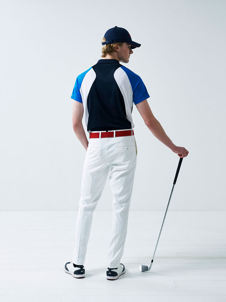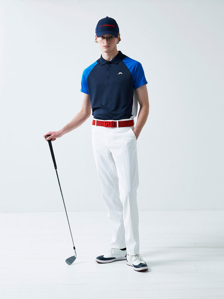 袖と背中のカラーブロックが特徴のポロシャツは、ストレッチ性抜群のアイテム。赤の小物を取り入れることで、しまったコーデに。