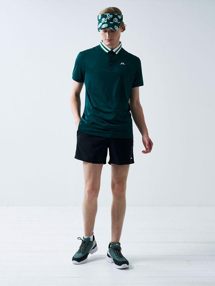 リブ襟のストライプがスポーティーで映えるグリーンコーデ。今期デザインのバイザーをコーデのワンポイントに。シンプルなデザインのショートパンツは、伸縮性のあるウエストで使いやすく重宝するアイテム。
