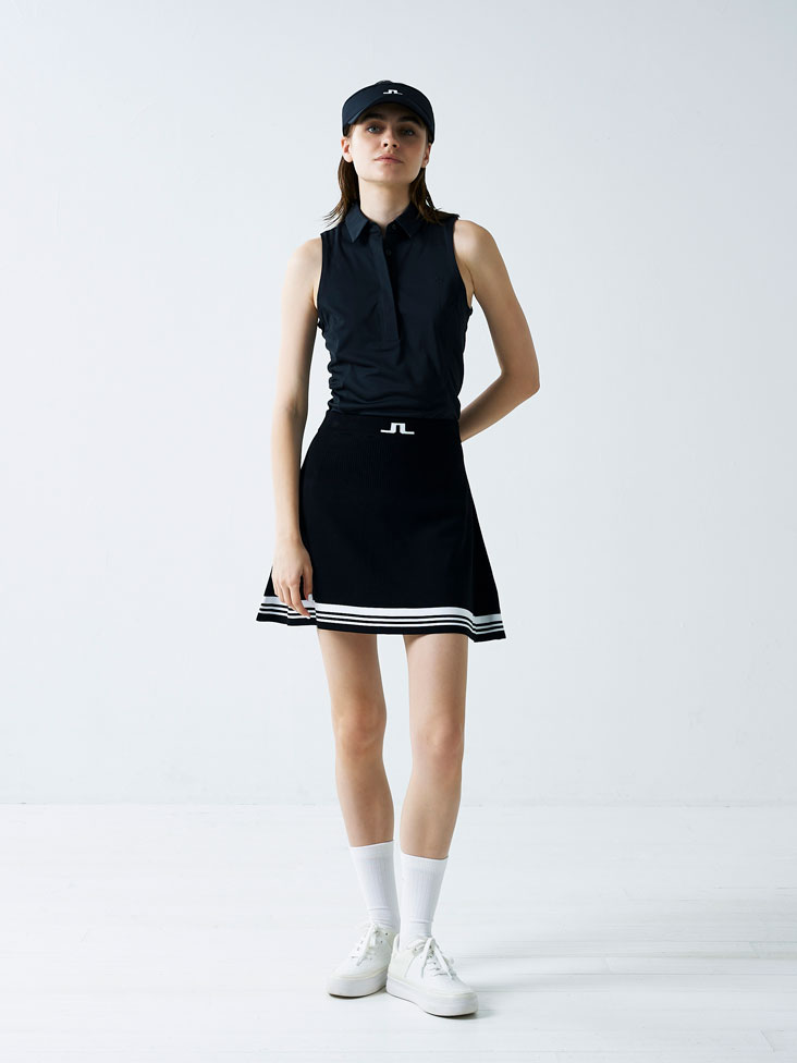 ブラックでまとめたシックなコーデ。スカート裾のスポーティーなラインがワンポイントに。シンプルなデザインに映えるブリッジマークがかっこいいスタイリングとなっています。