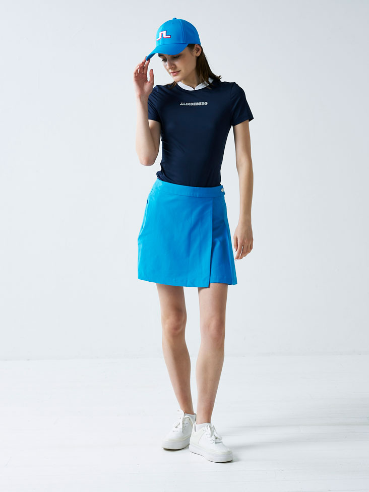 ブルーでまとめられクールな印象ですが、トップスの襟とスカートのサイドプリーツで可愛らしさを兼ね備えたコーデに。トップスはストレッチがきいておりエアリーな肌触り。背中にはブリッジマークがあしらわれています。