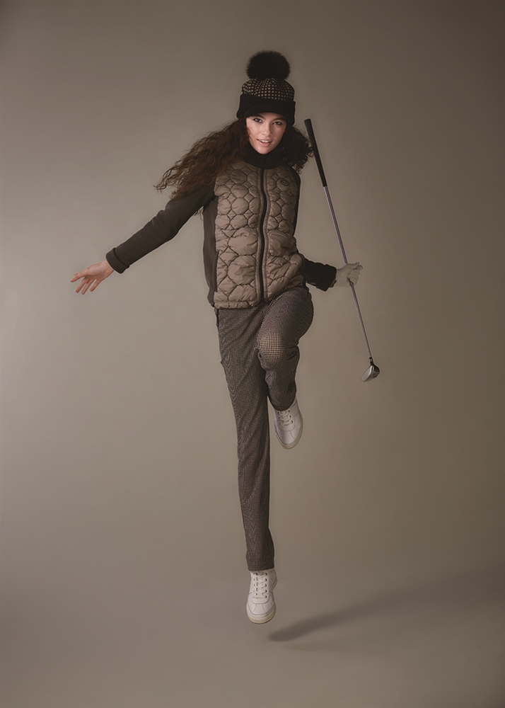 前見頃にサークルキルティング、袖、後見頃は、東レの保温性、軽量、耐摩耗性に優れたカルイシを使ったブルゾン。非常に軽くてあったかいので、ゴルフに最適です。キルティングの表素材は、ポリエステルの防水透湿素材で、収縮キルティングして凸凹感を出して、伸縮もあります。ウール混のニットで、ヒートパフォーマーの柄をジャガードで編み、つば折り返し部分はモールの糸で編み、トップには大きなブルーフォックスのボンボンを付けた冬のゴルフのためのニット帽。内側はフリースになって暖かいです。