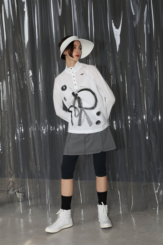 フルダル糸を使った透けにくく軽くドライな風合いが特徴の素材のスカートにクロップトのレギンスの一体化。コーディネートは決まってくるので、セットにしています。レギンスはUVカット、吸水速乾機能のリサイクルベア天を使っており、残暑が残る季節でも長く使えます。