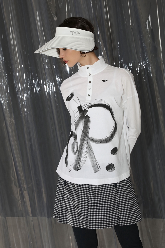 手書きでmunitalpのMとPとドットを書いた便利な強撚コットンの涼しい長袖シャツ。
