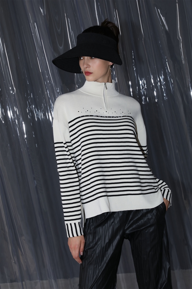 ボーダーセーターは胸元のMUNITALPロゴがキラキラしてワンポイント。薄手の軽い合皮にしわ加工を施したパンツと合わせ、シンプルなスタイリングでゴルフを楽しんでいただけます。