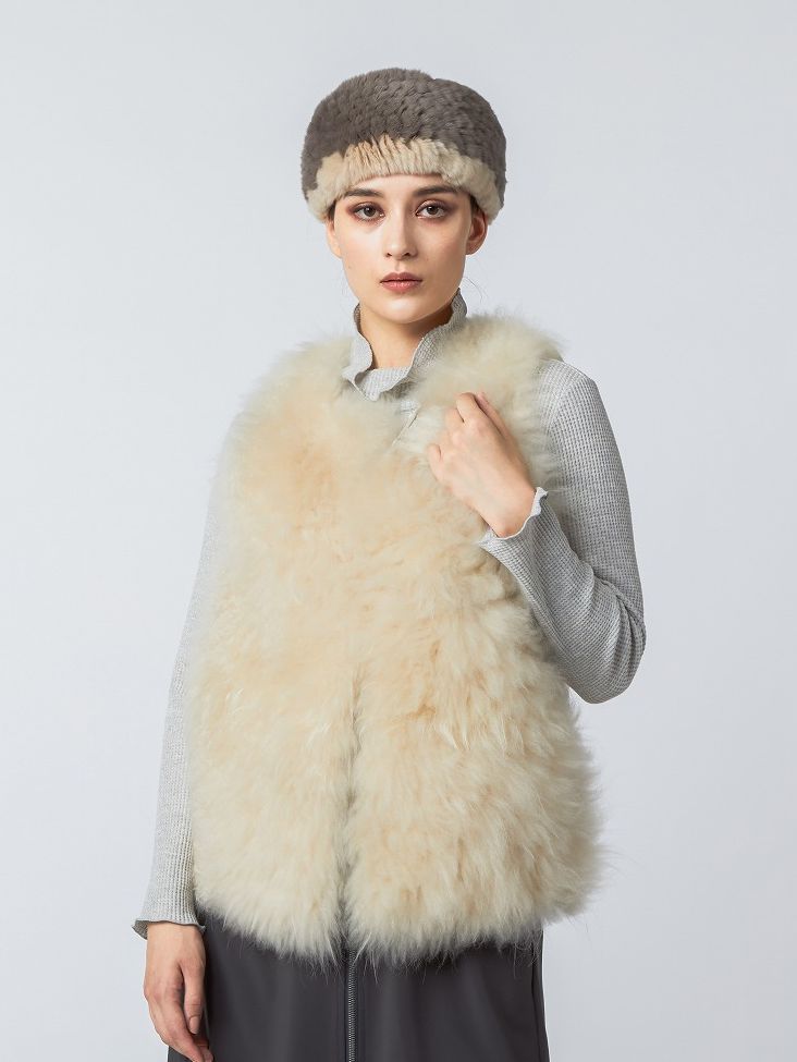 カシミヤ+レッキスのファーベストで、身頃にボリュームが出てゴージャスに演出。ベストワンピースと細身のストレッチボトムを合わせて、シルエットに変化を。
