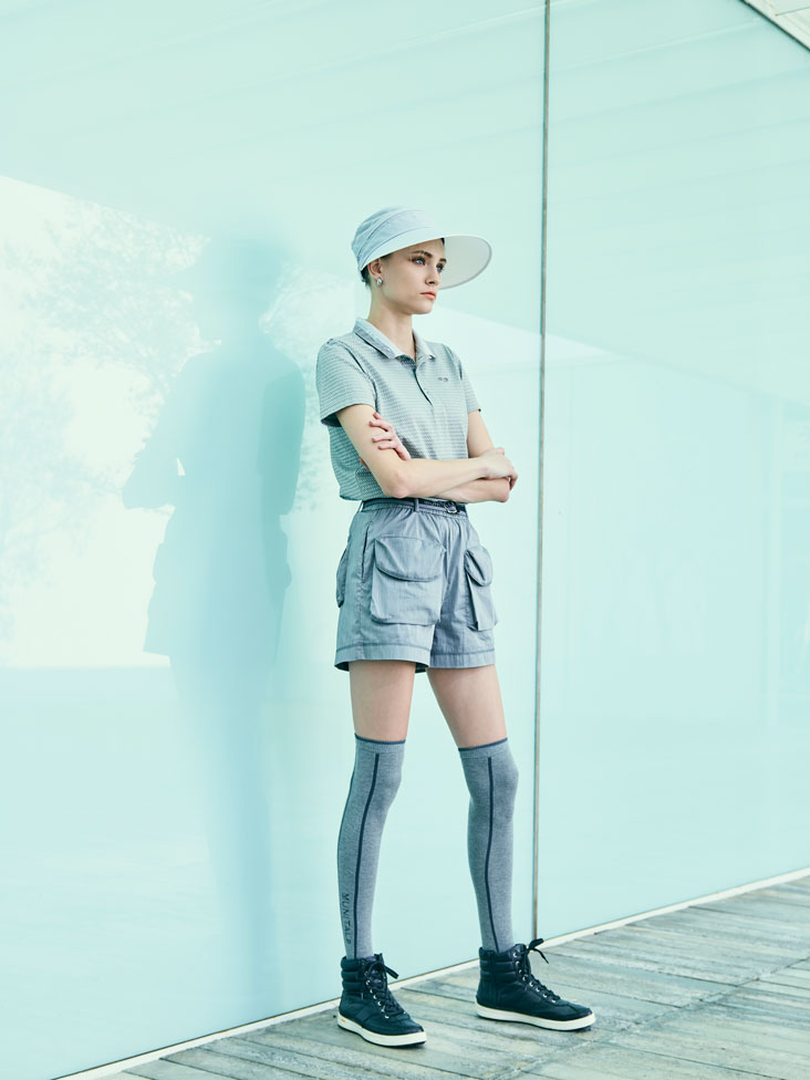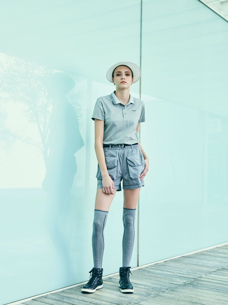 半袖シャツにショートパンツの、夏スタイリング。トップスは凹凸感による清涼感ある素材。衿にはスパンコール刺繍、キラリと光るボタンでシンプルながらも顔を引き立てる1枚に。ゴルフに便利な大きめのポケットがついたショートパンツは、速乾・UVカット・ストレッチ・接触冷感機能つきの機能性バツグンのアイテム。1枚で履いても、レギンスなどと重ね着してもかっこよく決まります。