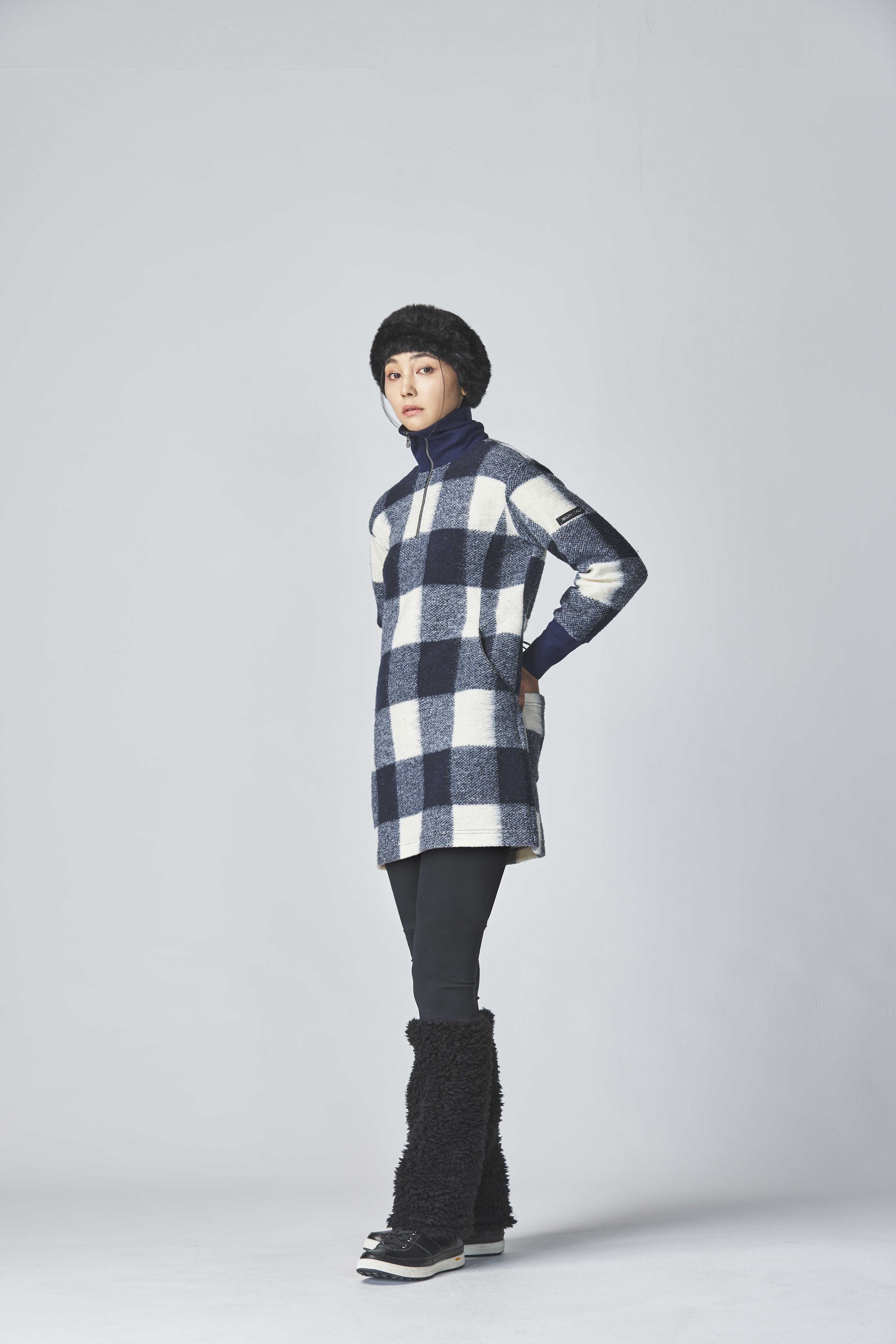 イタリアエアブラッシュニットの大きなブロックチェックのワンピース、こちらも、衿、袖口は暖か素材を使ているので、大動脈を温めますので、体全体があったかくなります。大きなチェックがグリーンに映えて、素敵なゴルファーです。耐えれるところまで、タイツやレギンスで行ってください。極寒ゴルフはやはりパンツはいてください。