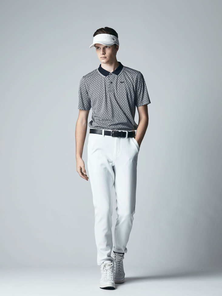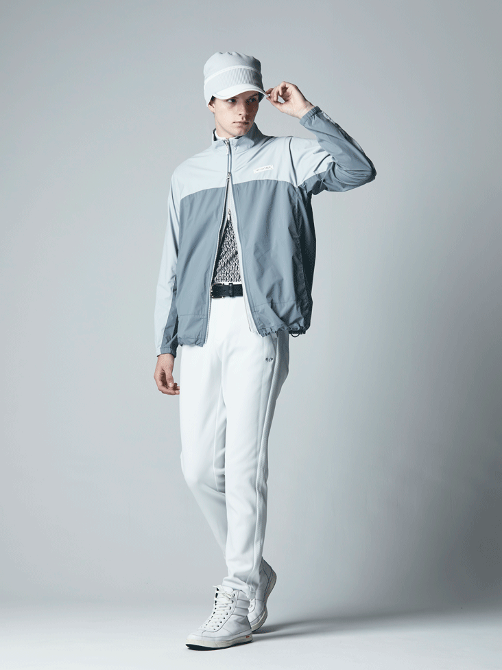 レイン用素材で、高い位置での切り替え、グレーのワントーンで足が長く見える効果が期待出ます。パンツは肌離れがいい裏の組織、程よく空気を含み、汗ばんでも体にへばりつきません。中に着ているベストはポリエステルで扱いやすく、裾にはロゴを控えめに入れています。ポロはクリップのような柄がポップでかわいいです。