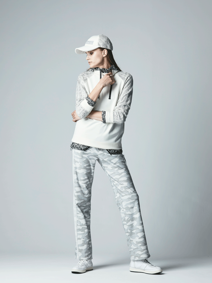 あえて風除けの為もあり、インに7Dのウインドブレーカーを着て、レオパード柄を裾、袖口から見せ上下にワンクッション置くことでインパクトを残せます。オーバーに着てるミドラーはお袖がメッシュの上にメタリックな箔プリントをしてあり、初夏になっても楽しめます。パンツは少し幅広にしたカモフラ、再度には裏で透けて見える柄で統一感を出しています。