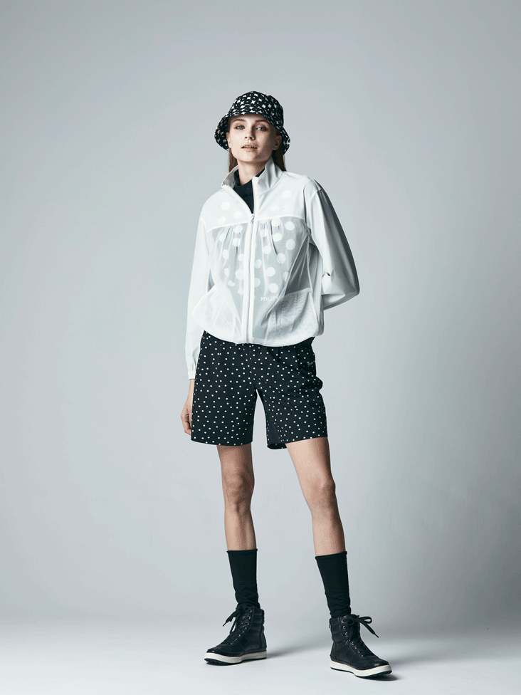 太陽、雨を考慮した素材のゴルフウエア。肩からお袖にかけては撥水UVカット機能のある生地を使ったシアーなブルゾン。下の長袖シャツのドットの柄がかわいく透けています。ショートパンツは大胆なボタニカルプリントで素材も気持ちいいです。