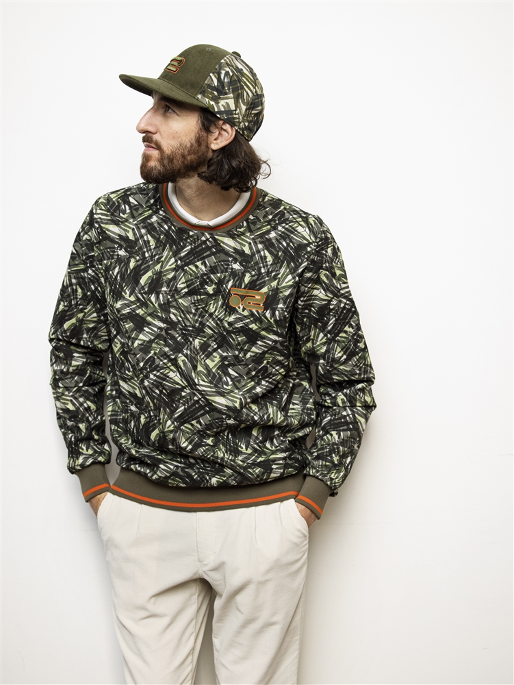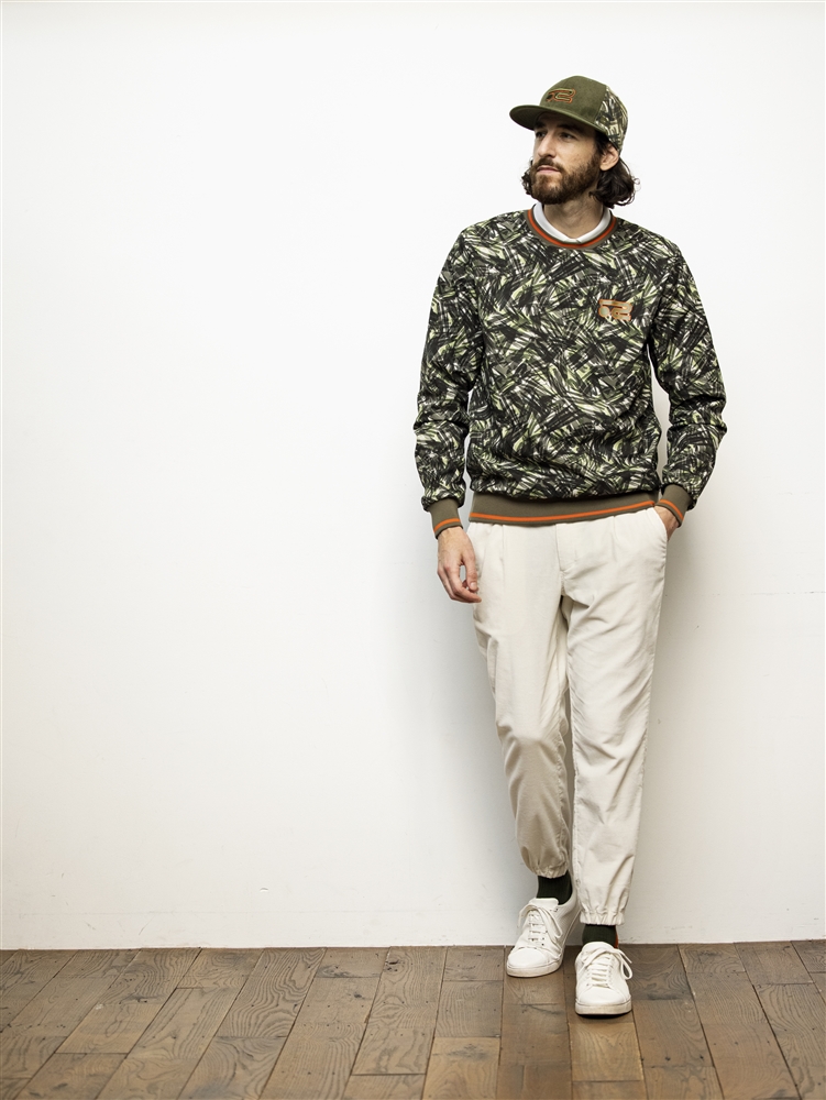 カレッジロゴが効いたスウェットニットと撥水タフタプリントのスニードジャケットの要素を一枚に詰め込んだリバーシブルプルオーバーに、ワイドシルエットの軽量コーデュロイパンツを合わせたスタイリング。特徴的な『グラフィティ迷彩』柄のプリントをウエアやキャップをセットで着用する事でオシャレ感が抜群にUP。シンプルに着たい場合はカレッジロゴ面をメインに街着としてもかっこよく着る事ができる。