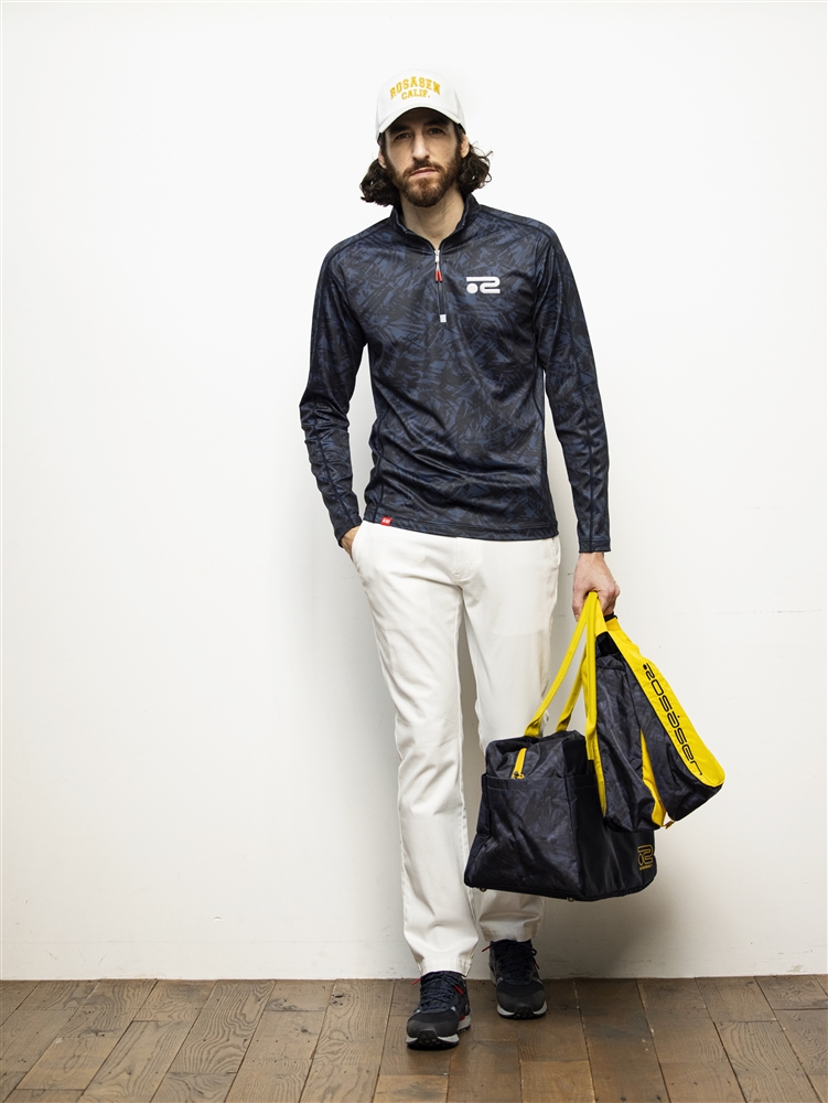 エコベアスムースとよばれる高機能でゴルフに最適な素材に、グラフィティ迷彩プリントをしたスタンドファスナーデザインのトップス。一枚で着用でき、防風機能があるのでインナーとしても活躍。