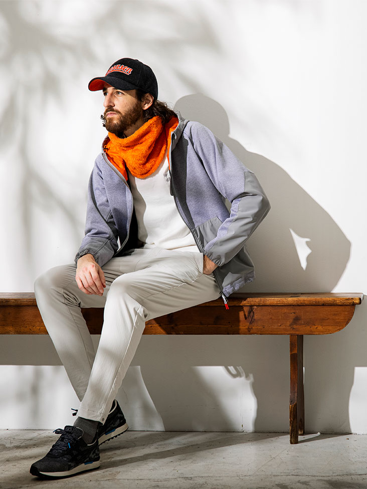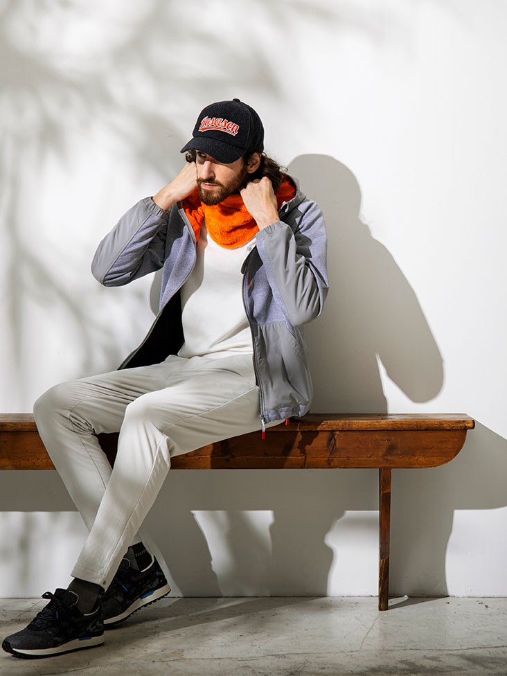 3層ストレッチ素材のフードには中綿とキルトの組み合わせがポイントのジャケットと高機能ストームフリースパンツを合わせ、アウトドアシーンにも活躍可能な機能素材を使ったコーディネイト。一枚でも着用できるインナーのニットは迷彩柄をロゴや衿、袖に入れており、昼間の晴天の気温では一枚で、日が暮れてきたらアウターとネックウォーマーで特徴のある差し色を入れてコーディネイトする事でかっこよくきまる。パンツ素材についてはアウトドアブランドでも使われる素材な為、素材の完成度が高く、普段履きはもちろんマルチなシーンで合わせる事ができるアイテム。