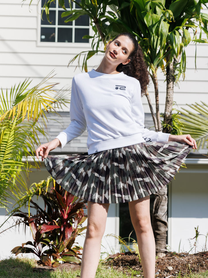 軽やかなミニ裏毛のスウェットとオリジナル迷彩柄のプリーツスカートを合わせたスタイリッシュなスタイリング。スウェットの背面プリントは袖までデザインロゴプリントを施したインパクトのあるアイテムでプリーツスカートはスイングしても広がりすぎない様に計算されたシルエットに。全方向可愛くキャッチーで春が待ち遠しくなるコーディネート