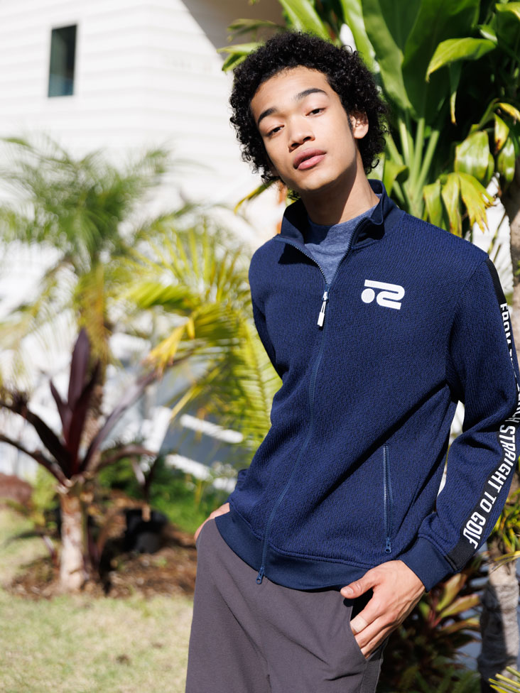 袖山にはプリントを施したブルゾンは裏面は細かい組織で作られている為、軽量で型崩れしづらく春先のアクティブな雰囲気にぴったり。インナーに合わせたシンプルなモックネックTは吸水、UVカット、接触冷感とパイル素材には珍しい高機能タイプで柔らかく肌当たりの良く機能性抜群のアイテム。ショートパンツはシャリ感とドライタッチな風合いを持つ表情感のある素材を使用。パイルの様な見え感に程よく張りのある素材で落ち着いたスポーティ&リラックスコーディネート