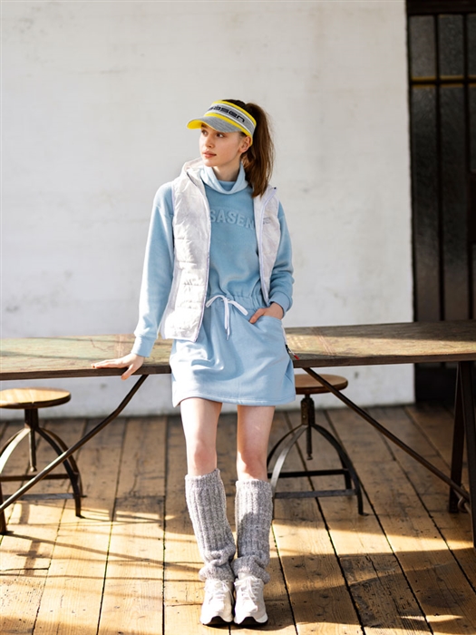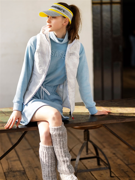 ベストは撥水・ストレッチ性に優れ、ドット迷彩柄をプリントしたリップストップ素材を使用し、蓄熱保温機能の中綿入り。ワンピースはストレッチ性や保温性に優れた柔らかな風合いの裏面ボア素材を使用。冬のゴルフが待ち遠しくなる女性らしいスポーティーなコーディネート。フェザーヤーン(羽のような糸)を使用し”ふわモコ”を表現したレッグウォーマーもポイントに。