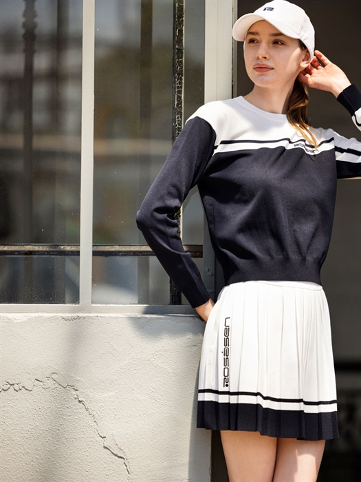軽量のポリエステル糸を使用したニットセットアップ。トップスはアシンメトリーの程よいデザインで、単品でもセットアップでも合わせやすいアイテム。スカートはスイングした時にプリーツが広がり過ぎないように分量を調整しています。