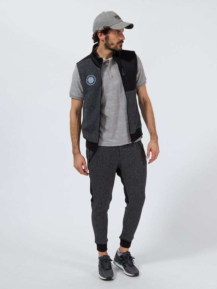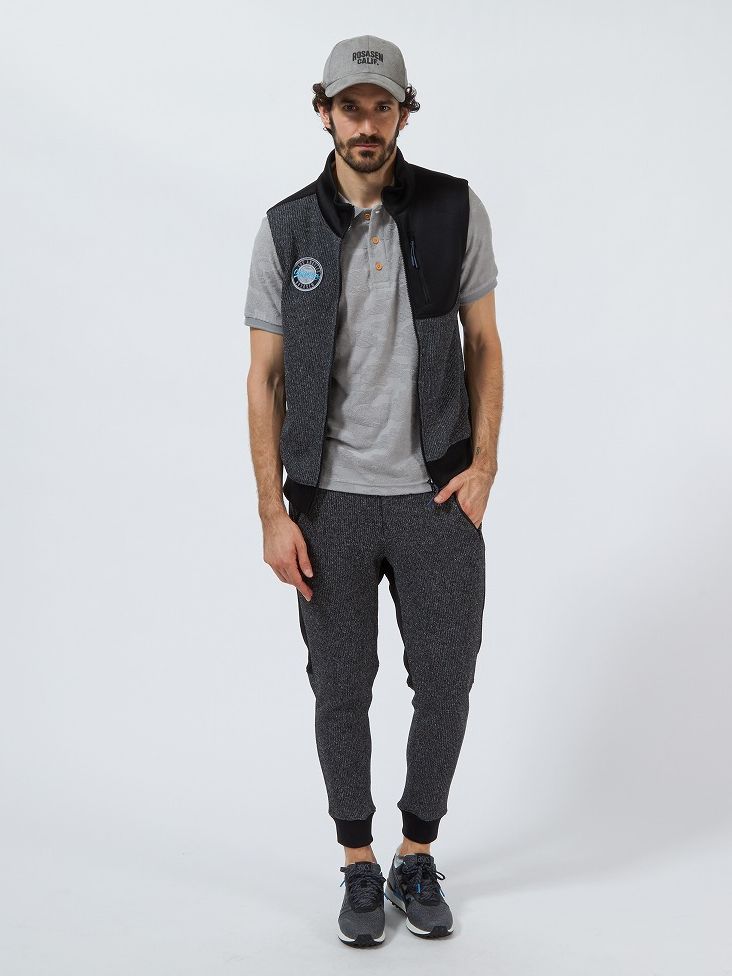 クォーターゲージのセットアップを使用したコーディネイト。ニットのような表面感ながら裏側をハイゲージにしているのでスポーツに適したハリ感も備えた素材。ベスト、パンツ共に軽量で通気性に優れた秋のラウンドに最適なアイテム。インナーのポロシャツ、キャップをモノトーンで合わせた大人のスポーティスタイル。